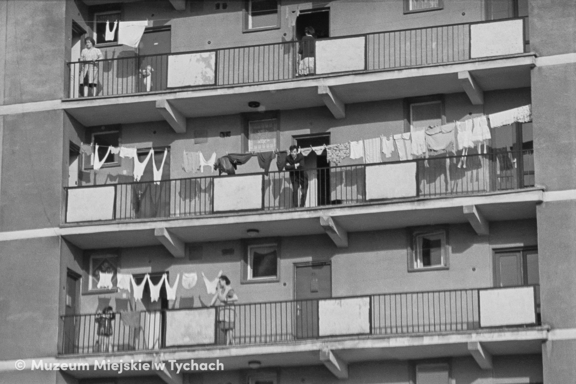 A north-west view of a fragment of a gallery block in Dębowa Street, with residents standing and laundry hang- drying on the balconies
