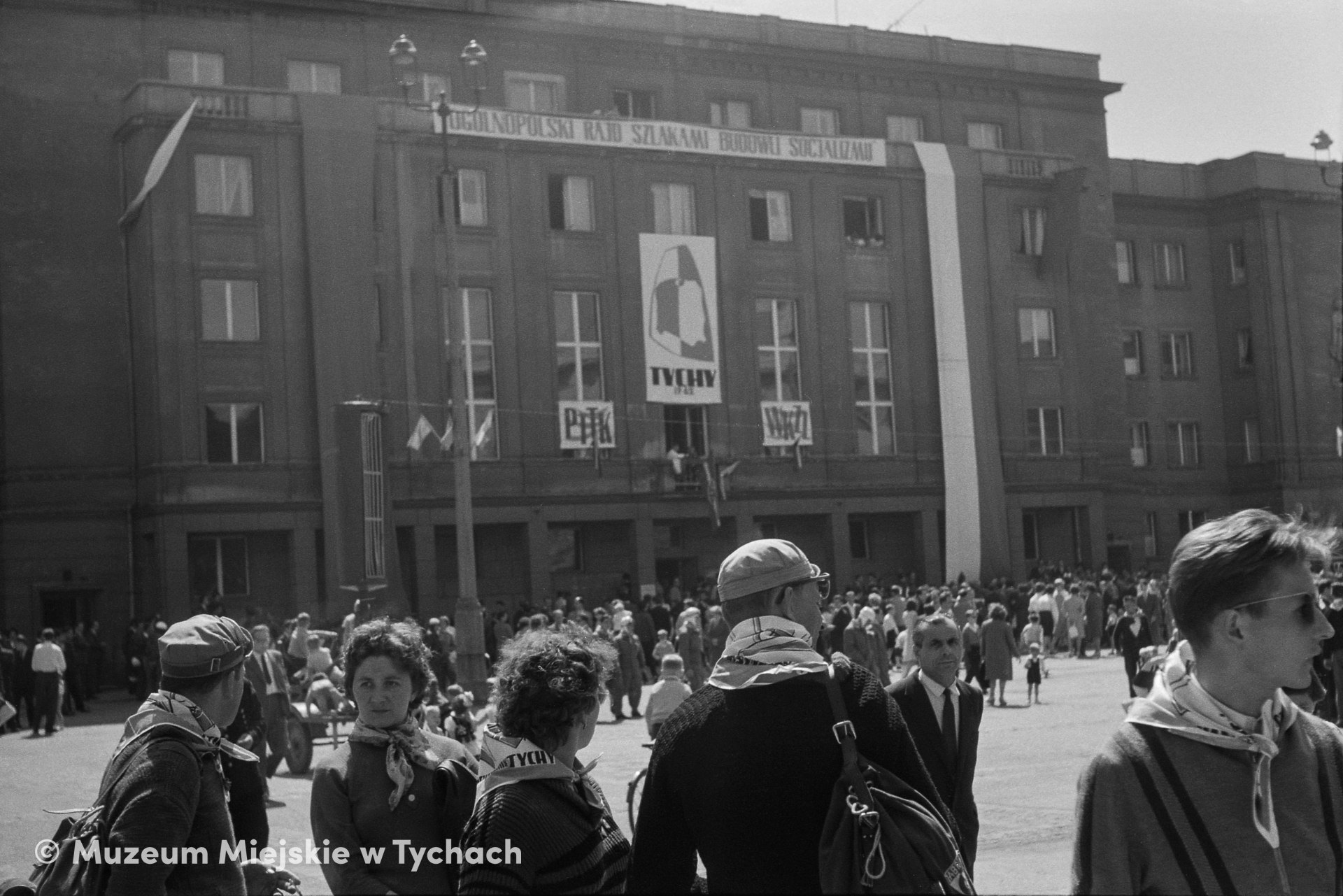 The closing ceremony of the All-Poland Rally along the Trails of Socialist Architecture, i.e. a motorcycle rally along the streets of Housing Estates A and B. Residents in front of the Culture Centre in Wincentego Pstrowskiego Square (now św. Anny Square).