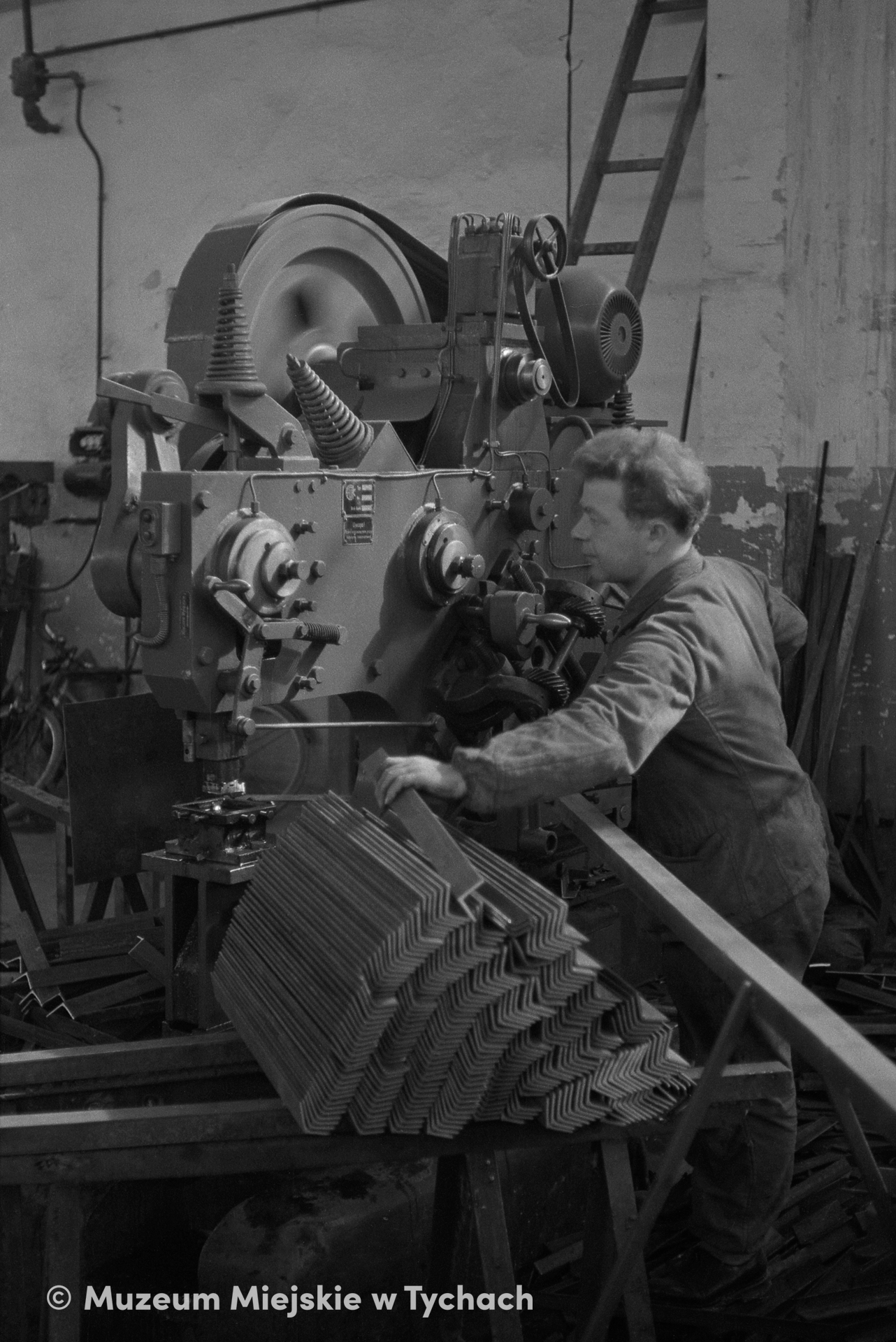 A metalworker cuts steel angle bars on a machine tool in a metalworking shop on the premises of a prefabrication plant.