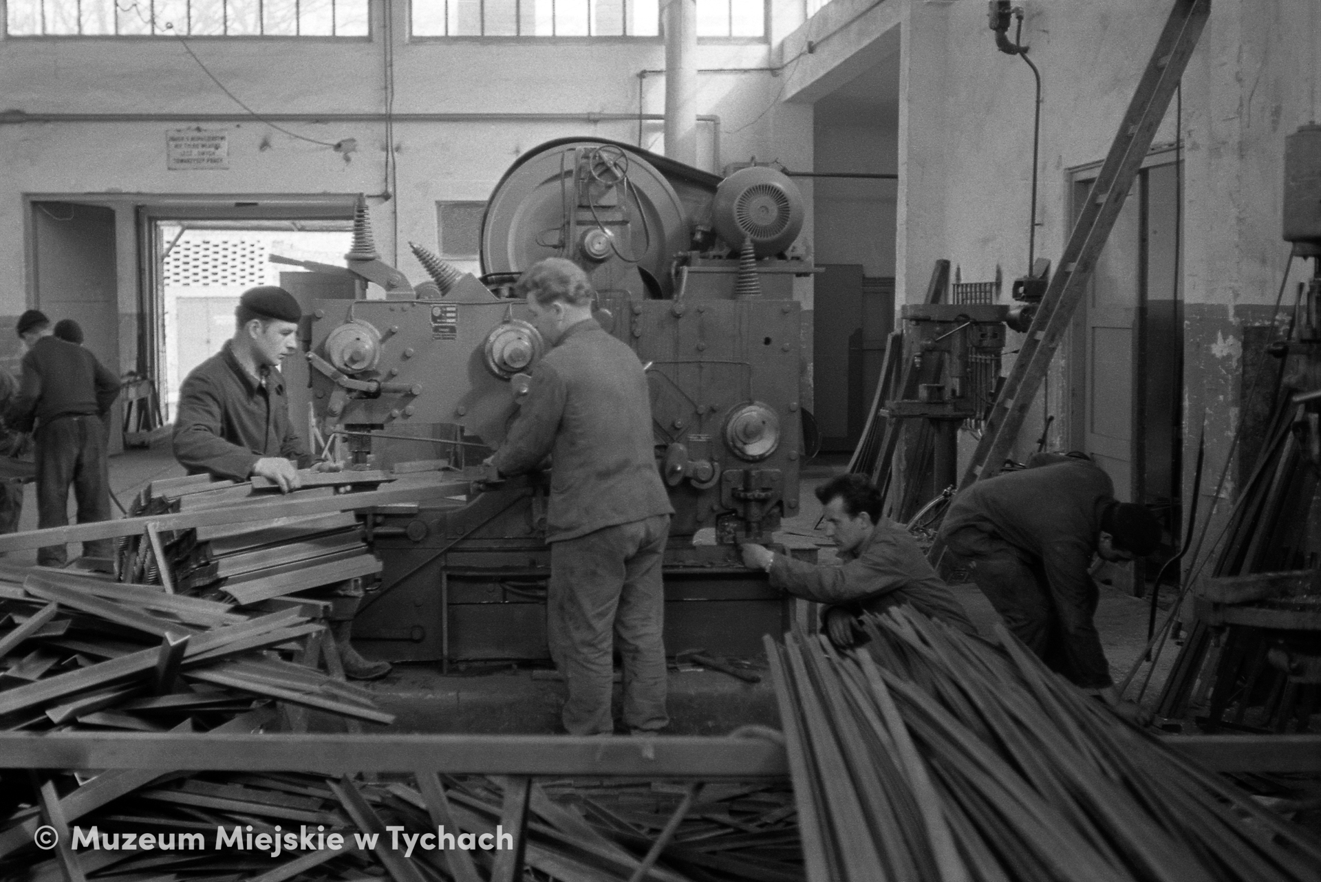 Metalworkers cut steel angle bars on a machine tool in a metalworking shop on the premises of a prefabrication plant.