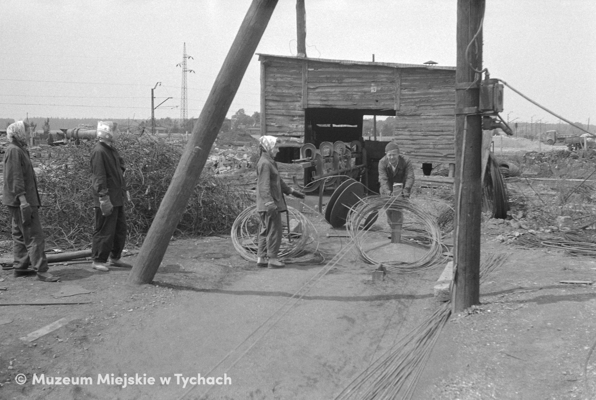 Builders prepare ribbed steel rods for concrete reinforcement. Photo taken on the premises of a prefabrication plant.