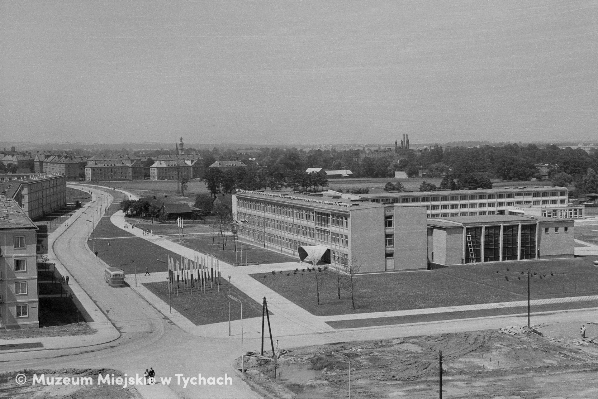 An elevated view of school buildings (now School Complex no. 5). Shown on the left is a fragment of Housing Estate E; in the background, some old cottages, Housing Estate B, the tower of St. Mary Magdalene's Church and the chimneys of Tychy's Browar Książęcy (Ducal Brewery).