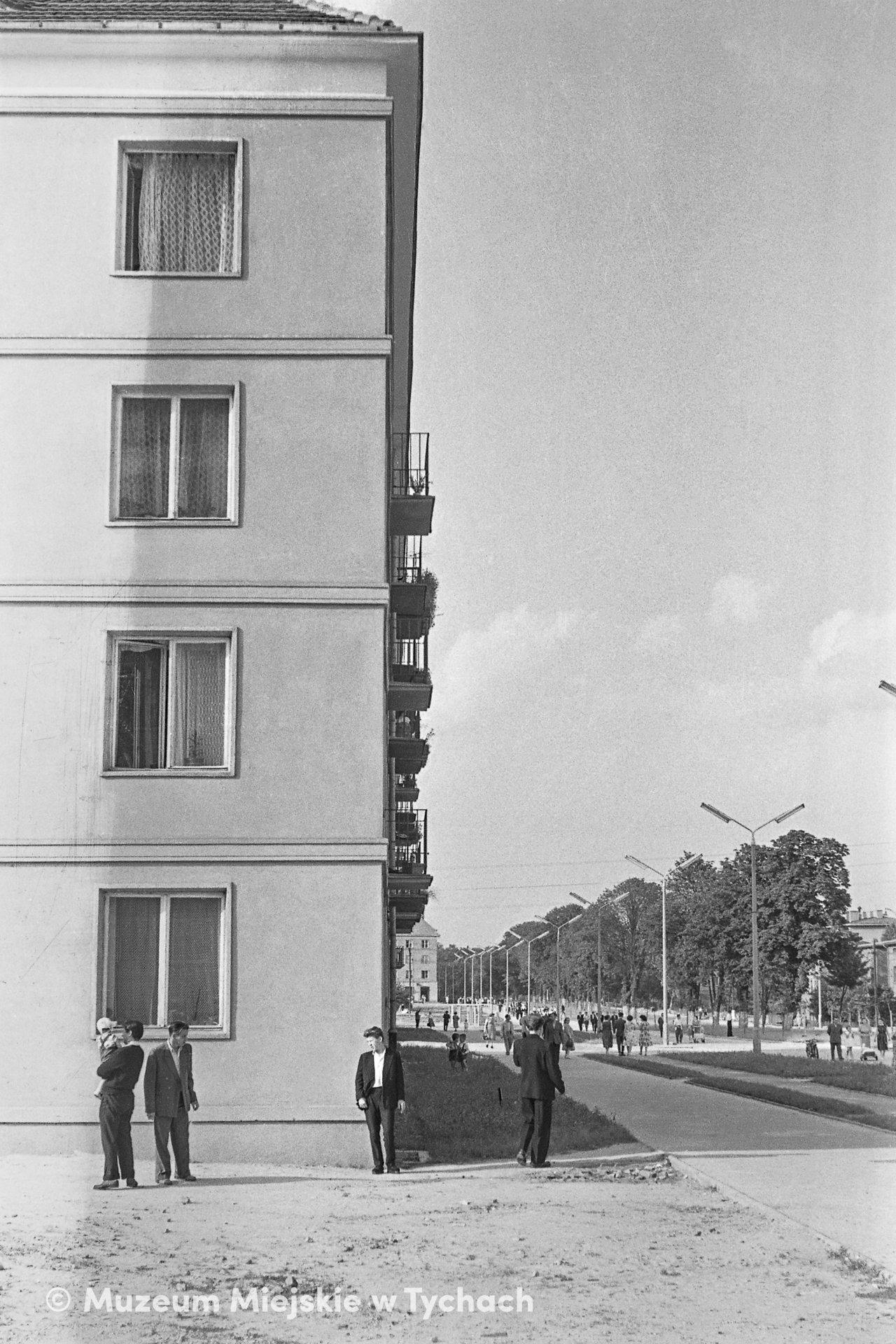 Men in front of a residential block. Spreading in the background is Bielska Avenue; a view from the south.