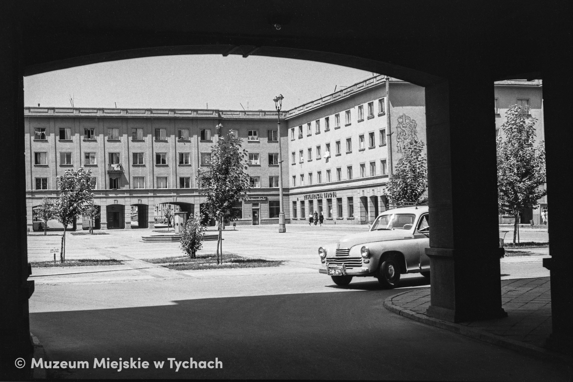 Wincentego Pstrowskiego Square now św. Anny Square) with a fountain. A view from underneath the arcades onto the western and northern frontage of the square and a parked M-20 Warsaw passenger car.