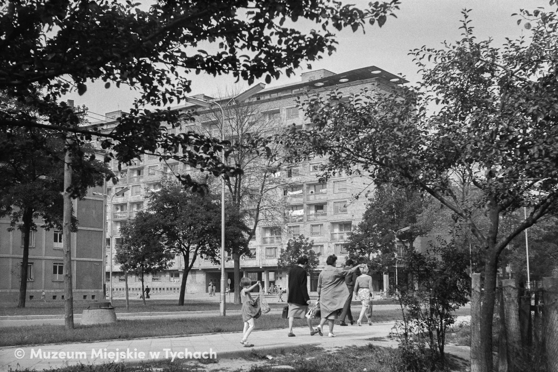 One of the first high-rise residential buildings in the city. A view from Paprocańska Street (Rewolucji Październikowej Avenue from 1968, now Niepodległości Avenue).