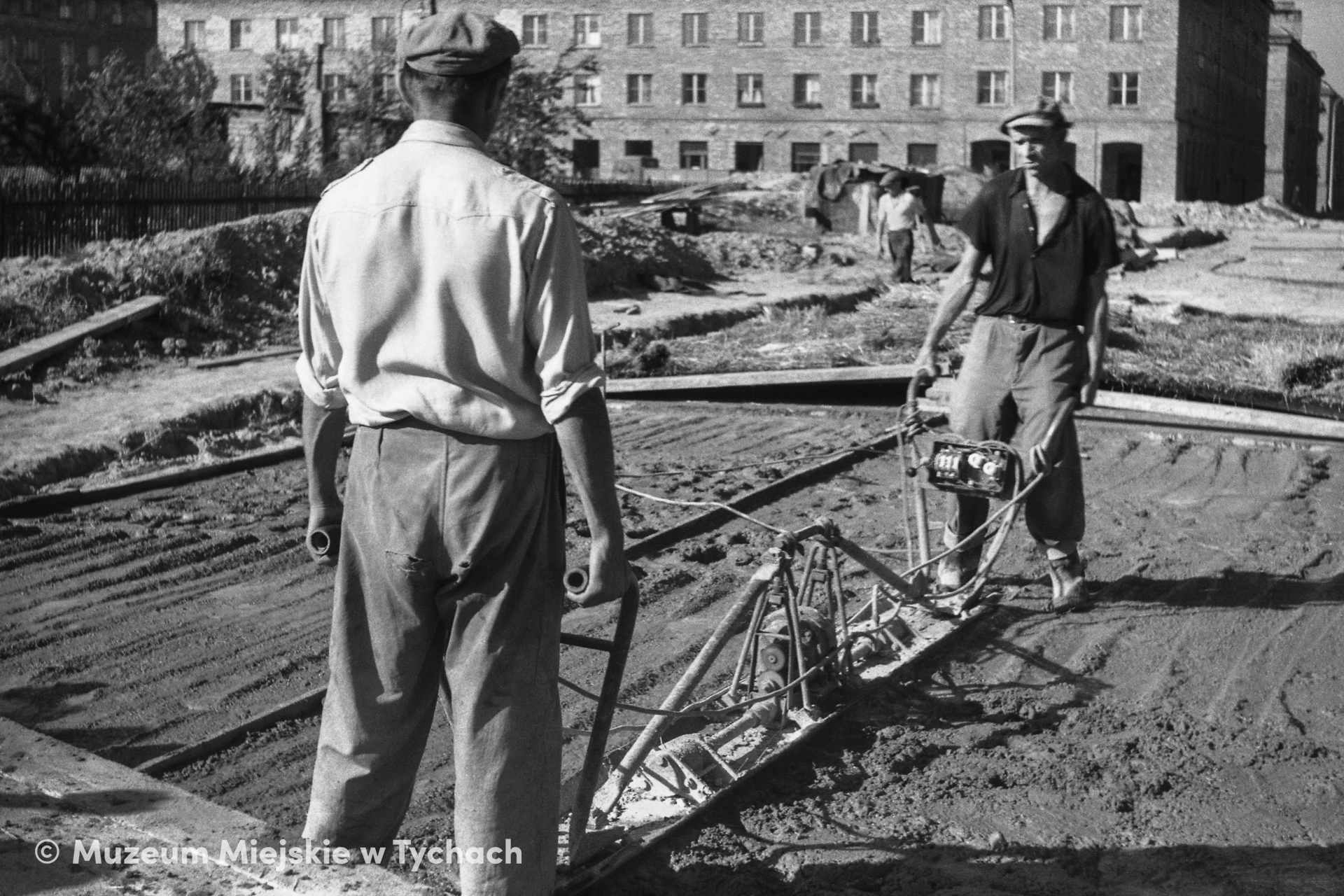 Construction of the second lane of Bielska Avenue. Workers lay tarmac mass on a previously installed sand and gravel substructure, evenly spreading and compacting it with a hand device. Featured in the background is a residential block in Budowlanych Street with service shops on the ground floor.
