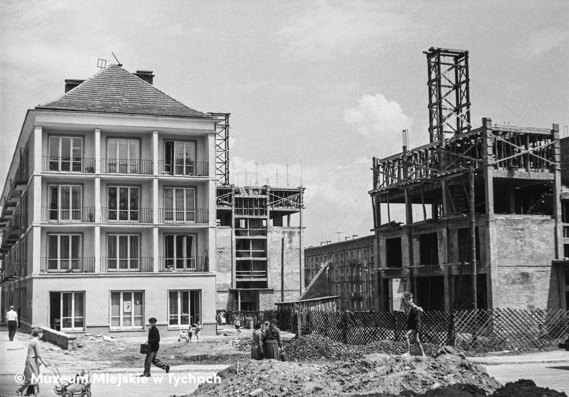 The gable wall of the residential block with Słoneczna Restaurant on the ground floor, with single-staircase blocks under construction nearby. Installation of the reinforced concrete structure and external walls of the buildings is underway.