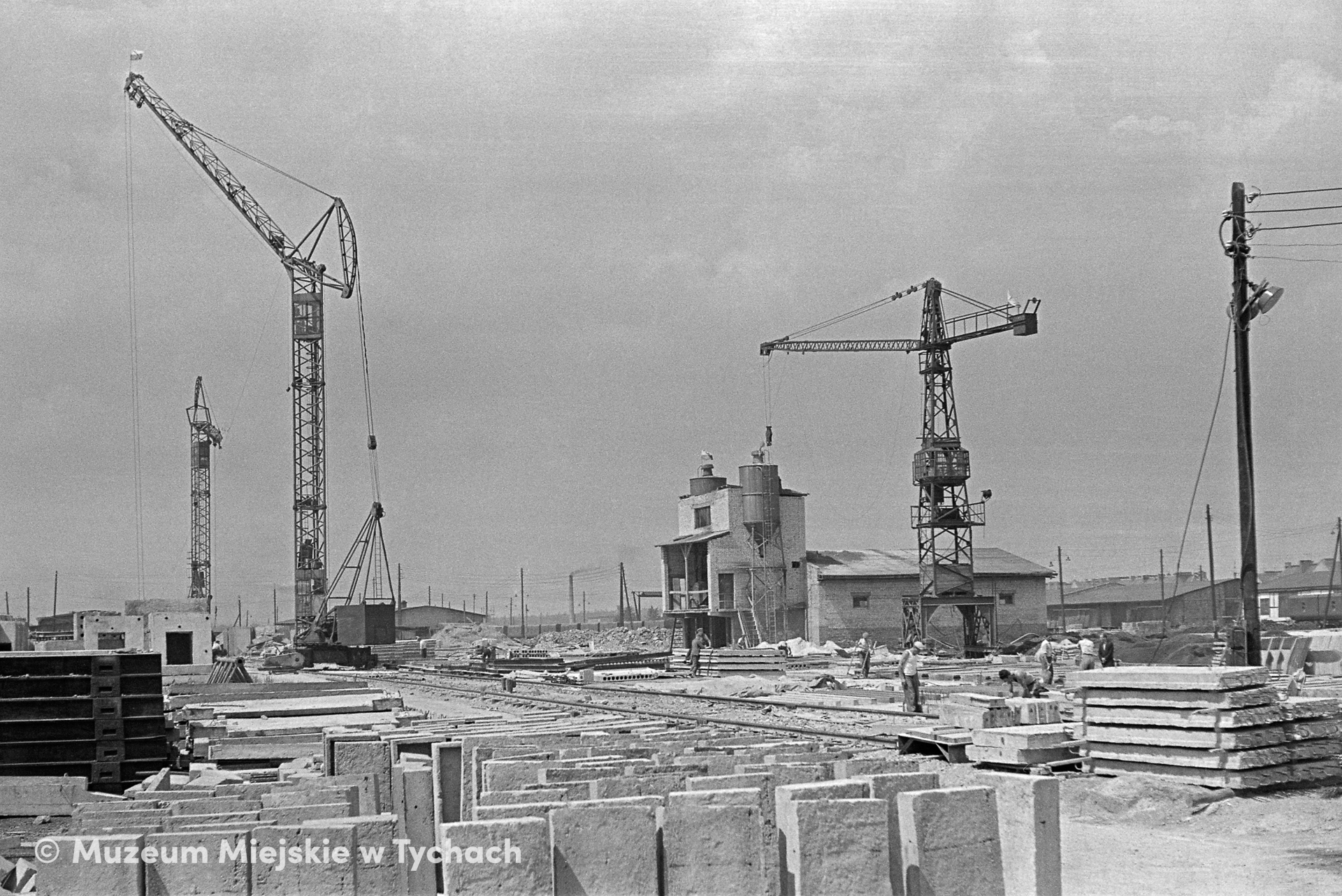 The yard where prefabricated elements are manufactured,sprayed, cured and stored. Visible in the background there are cranes on railway tracks and a concrete plant building. The photo was taken on the premises of a prefabrication plant.