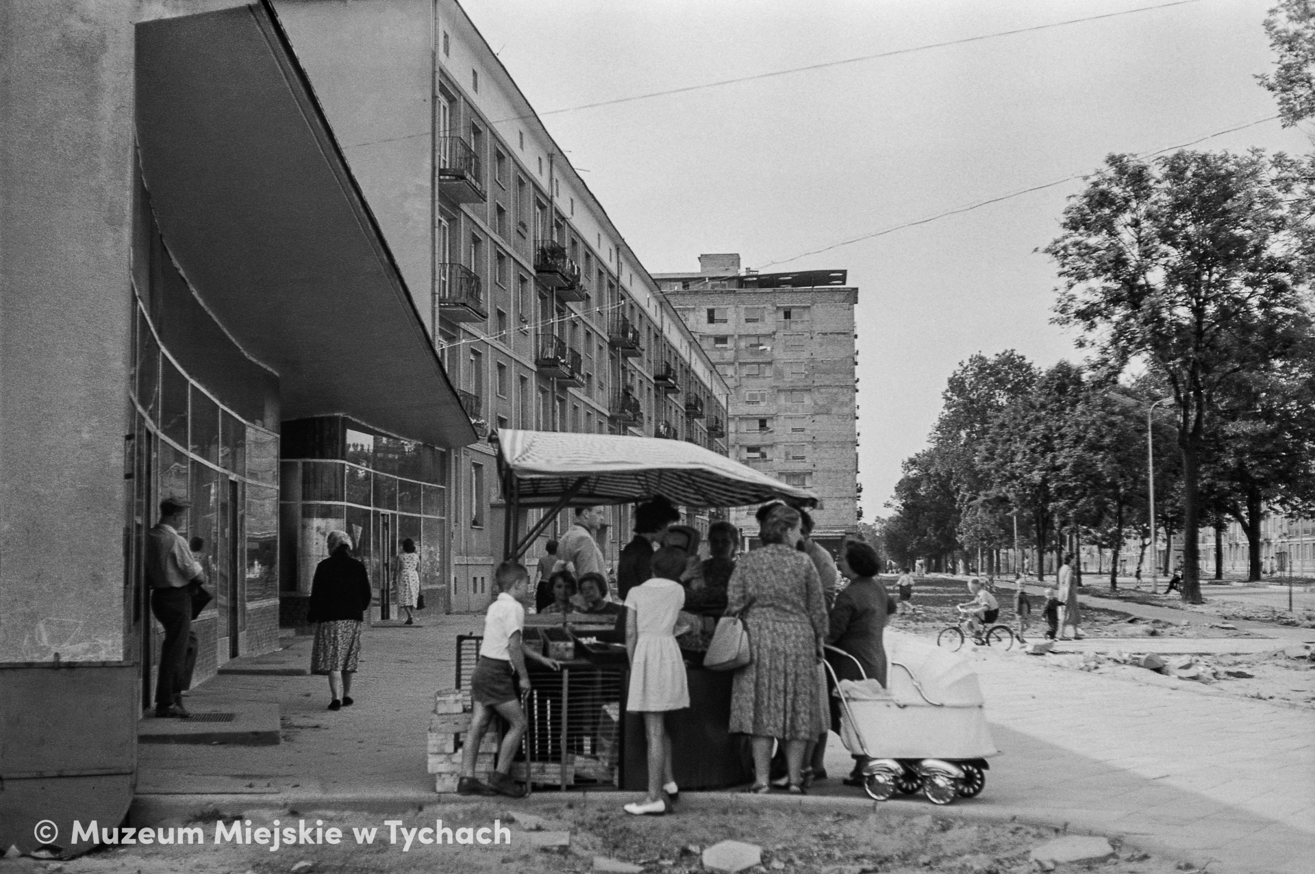 A retail pavilion adjacent to the gable wall of a residential block, with a passage leading to Cyganerii Street. In front of the glass façade with entrances to the shops stands a stall, from whch some women buy strawberries.