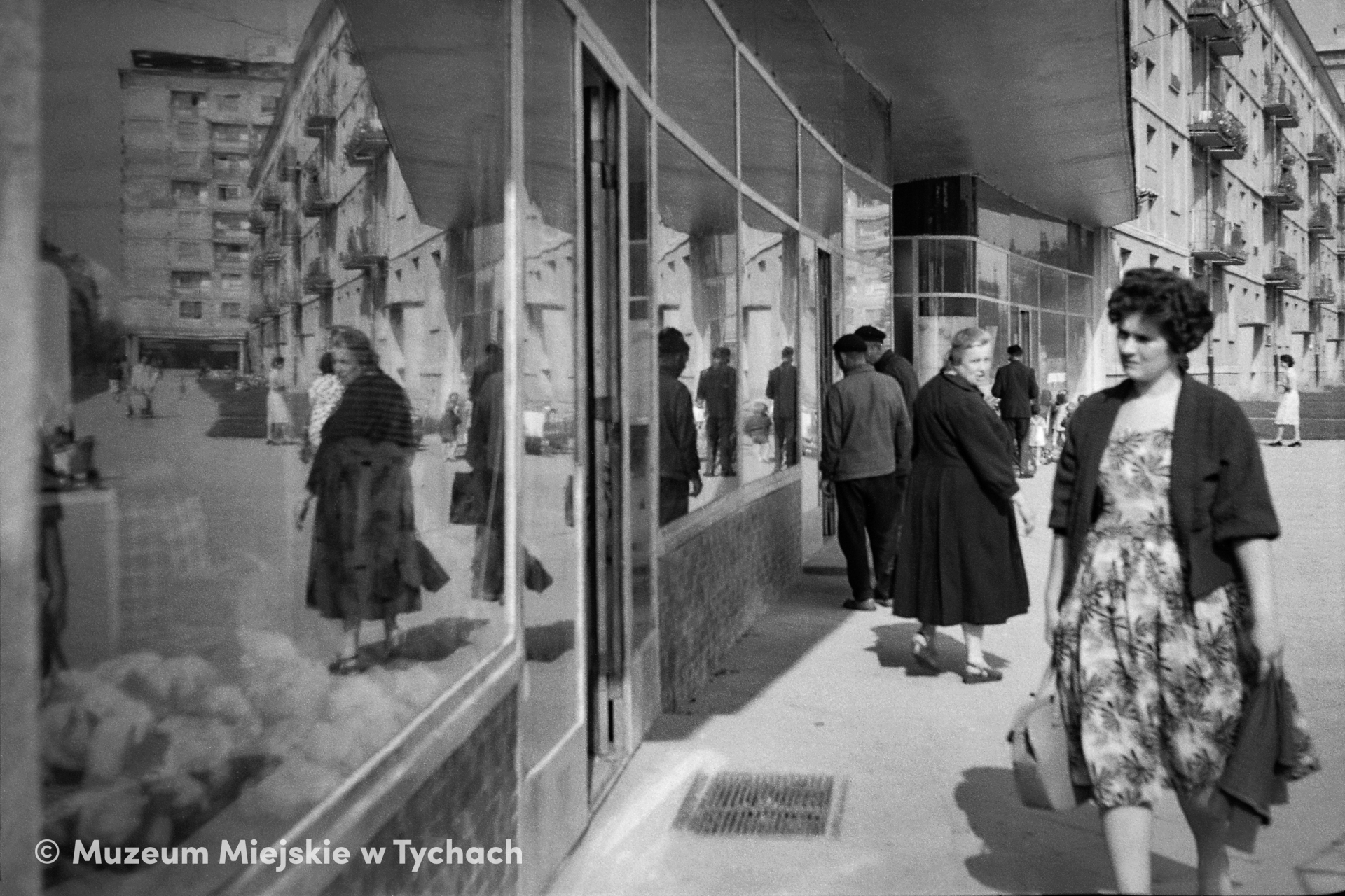A retail pavilion adjacent to the gable wall of a residential block, with a passage leading to Cyganerii Street. In front of the glass façade with entrances to the shops, women are on their way to do shopping.