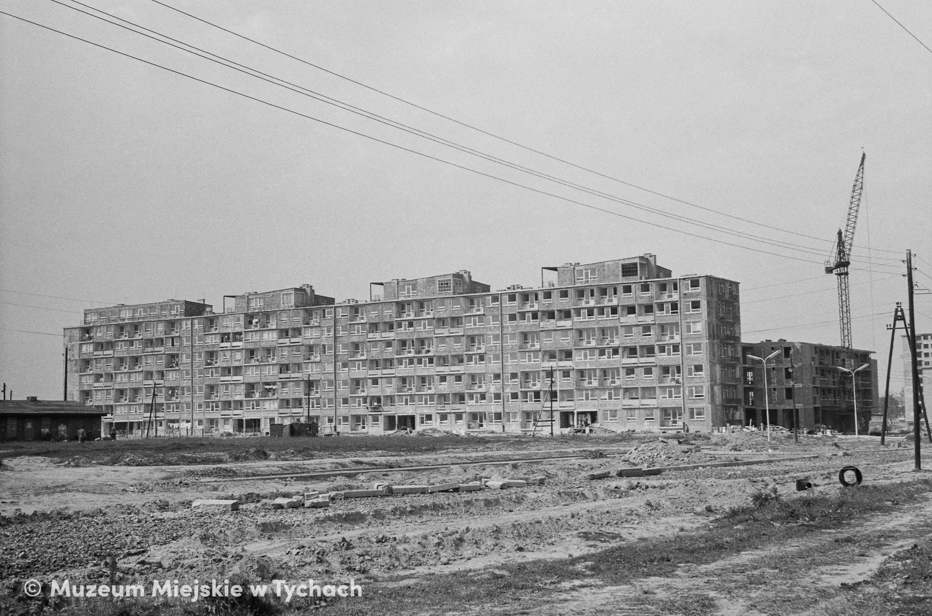 Construction of residential blocks in Housing Estate D1 in Karola Darwina Street and Paprocanska Street (Rewolucji Październikowej Avenue from 1968, today Niepodległości Avenue). A view from the area of today's Municipal Park.