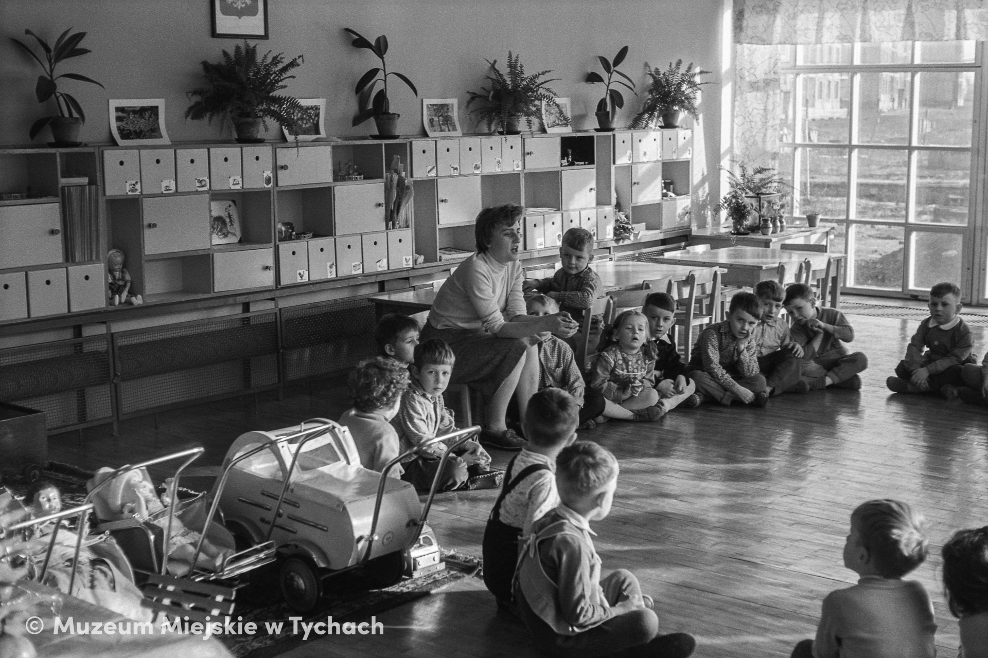Children with a teacher during classes in the pavilion nursery school at No. 7 Elfów Street. Currently, the building houses the 'Promyk' Private Ecology and Art Nursery School.