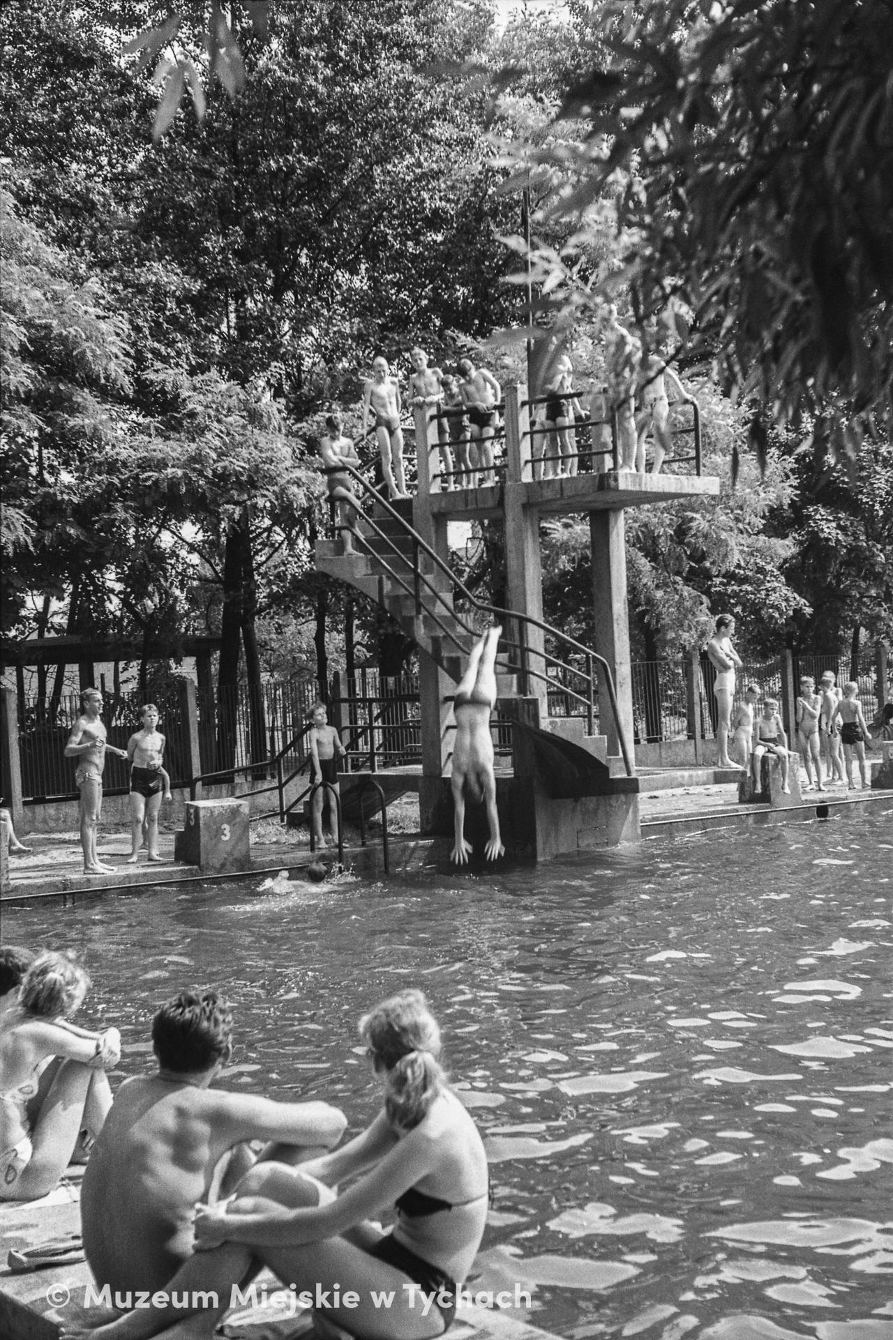 Children on a diving tower at an outdoor swimming pool located near the railway station and Housing estate A. The tower, which already existed in the 1930s, was adapted to the needs of the new pool, opened in 1959.