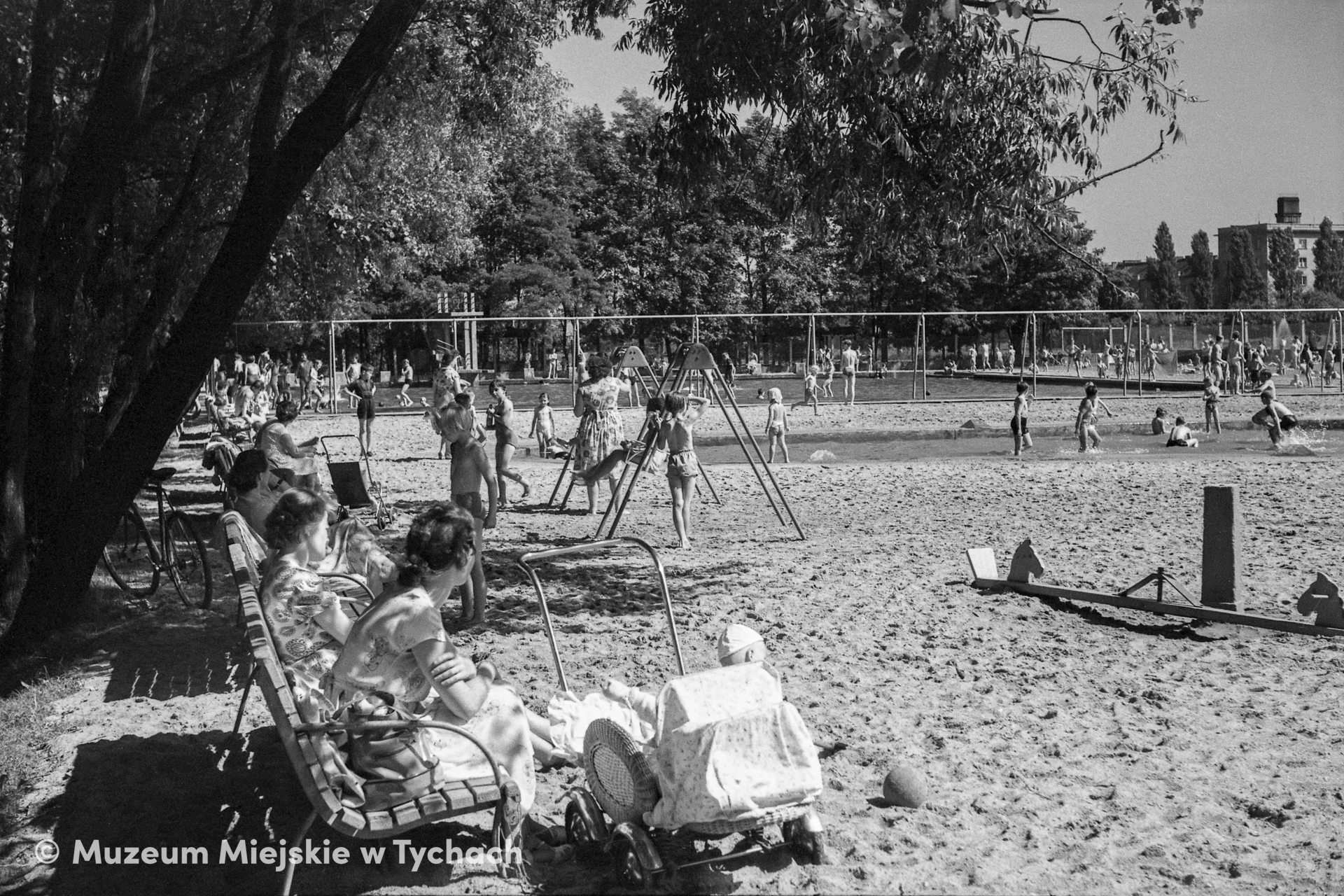 Residents on the premises of an outdoor swimming pool and a playground in a recreational complex near the railway station and Housing Estate A.
