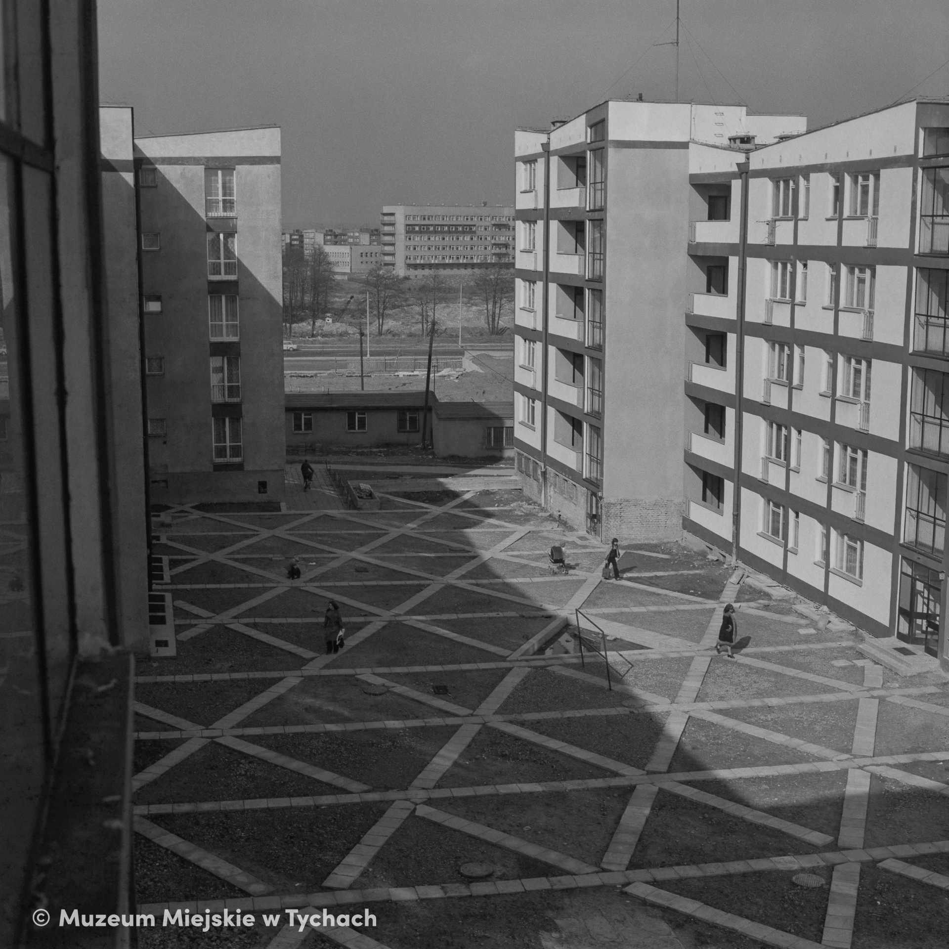 A view of the square between four-storey residential blocks in Housing Estate G. The area of the square is intersected by paved footpaths on which residents walk. There is a carpet hanger in the central part of the square .