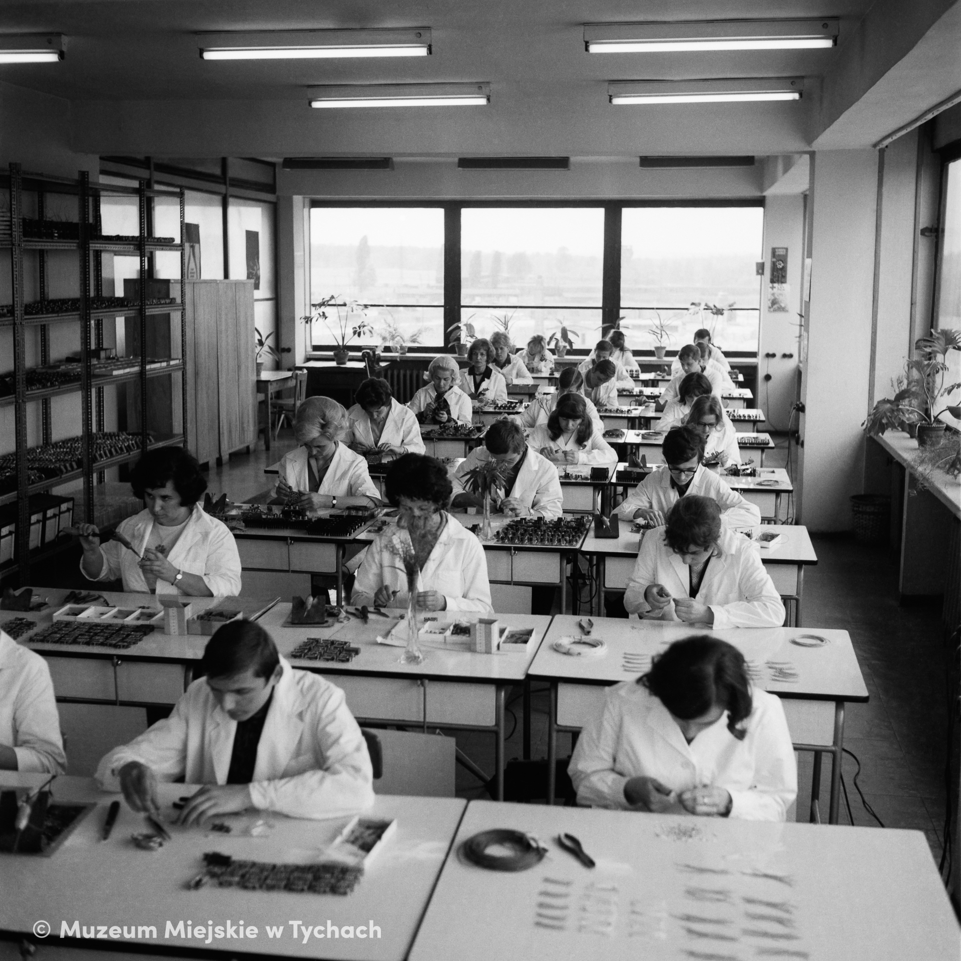 Assembly shop at the Mining Electronics Company. Workers assemble electronic components for control and measurement instruments for mining and power engineering.