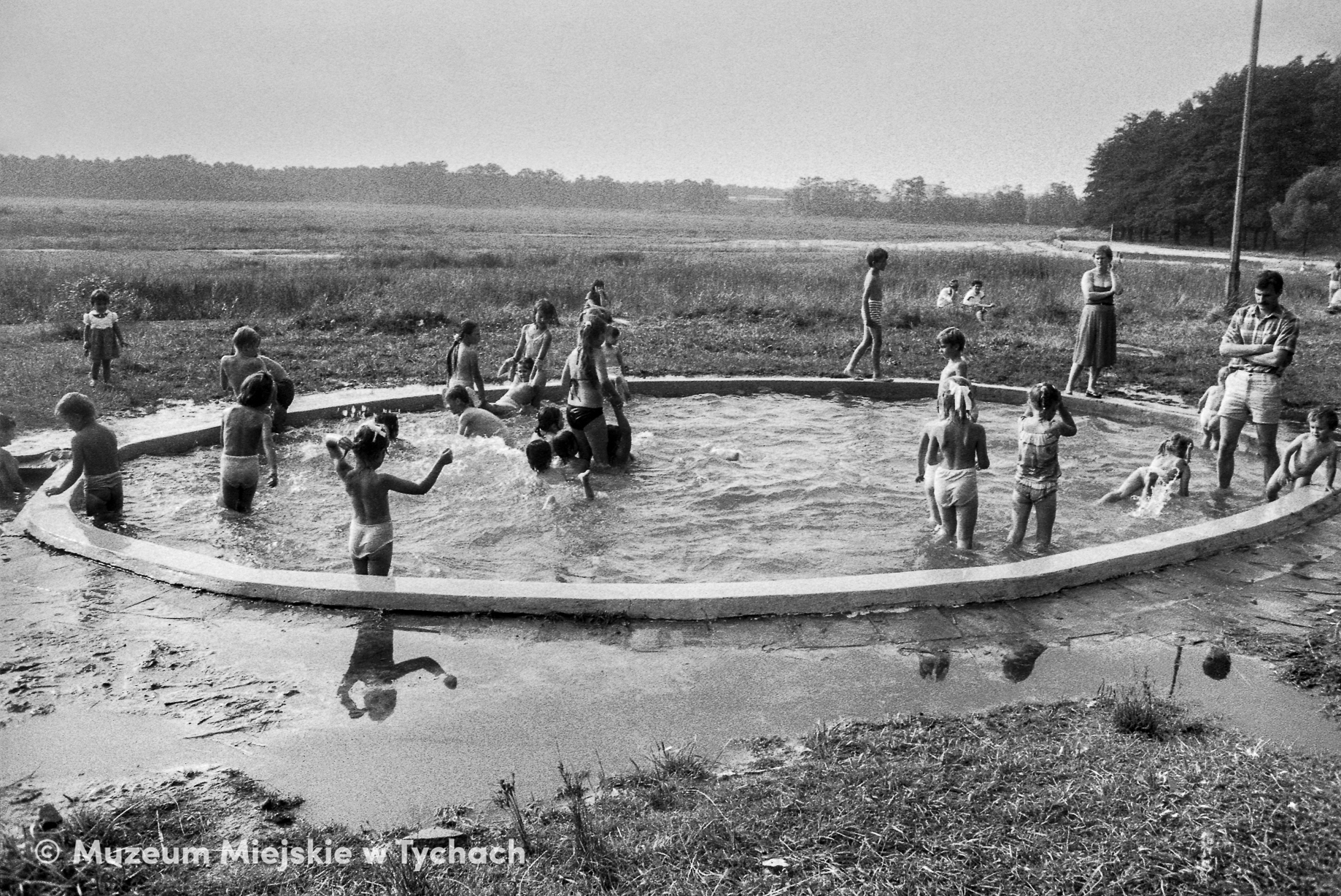 Children in a paddling pool on the premises of the Paprocany Recreation Centre. Food and refreshment pavillions in the background. The photo was taken at a community festival to mark the Day of the Rebirth of Poland.