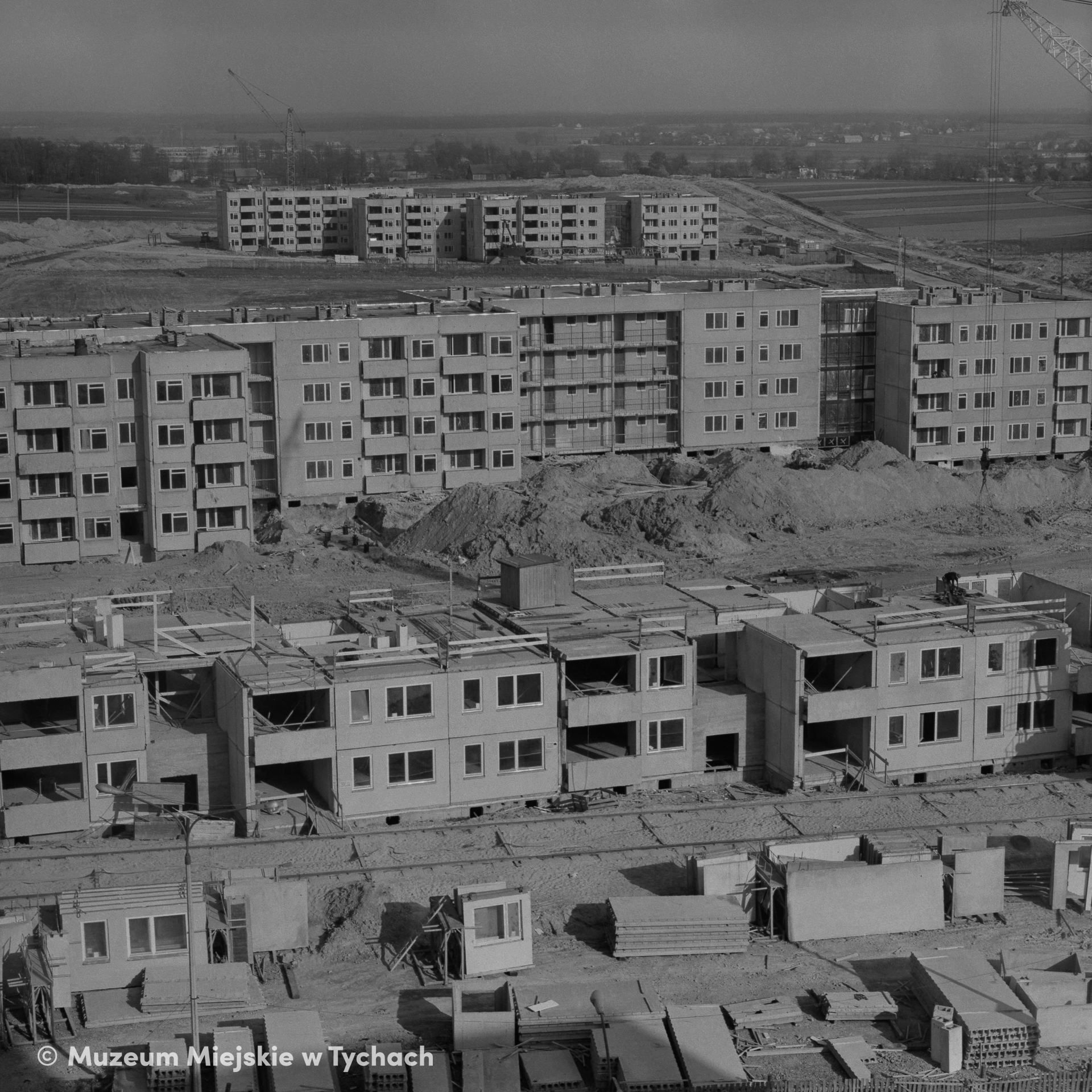 Construction of residential blocks in Housing Estate N. In the foreground, a high-rise block in Aleksandra Zawadzkiego Street (currently Romana Dmowskiego Street), with several-storey residential blocks behind it.