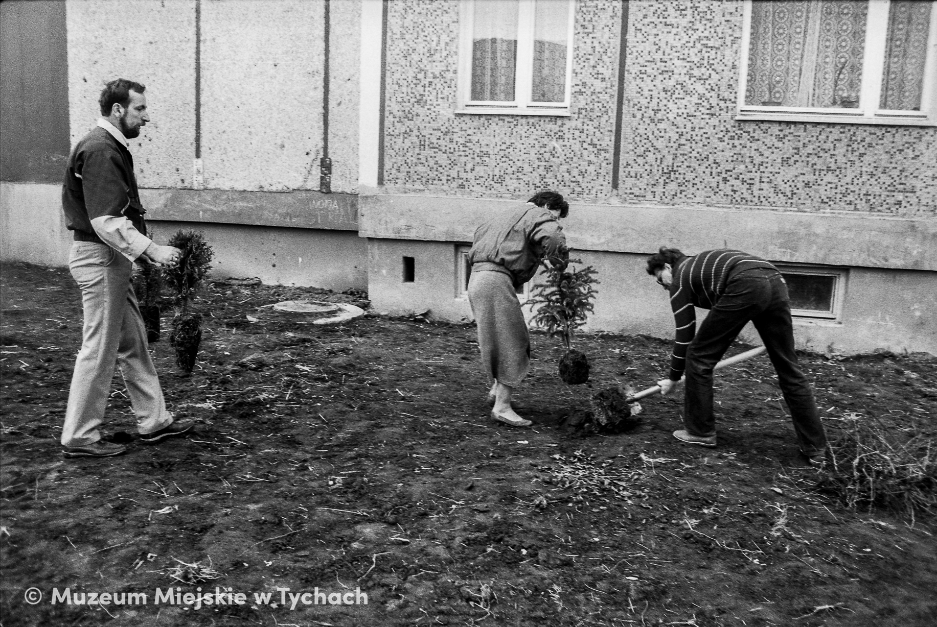 Residents plant shrubs in front of a residential building in Housing Estate Ł as part of a community service scheme.