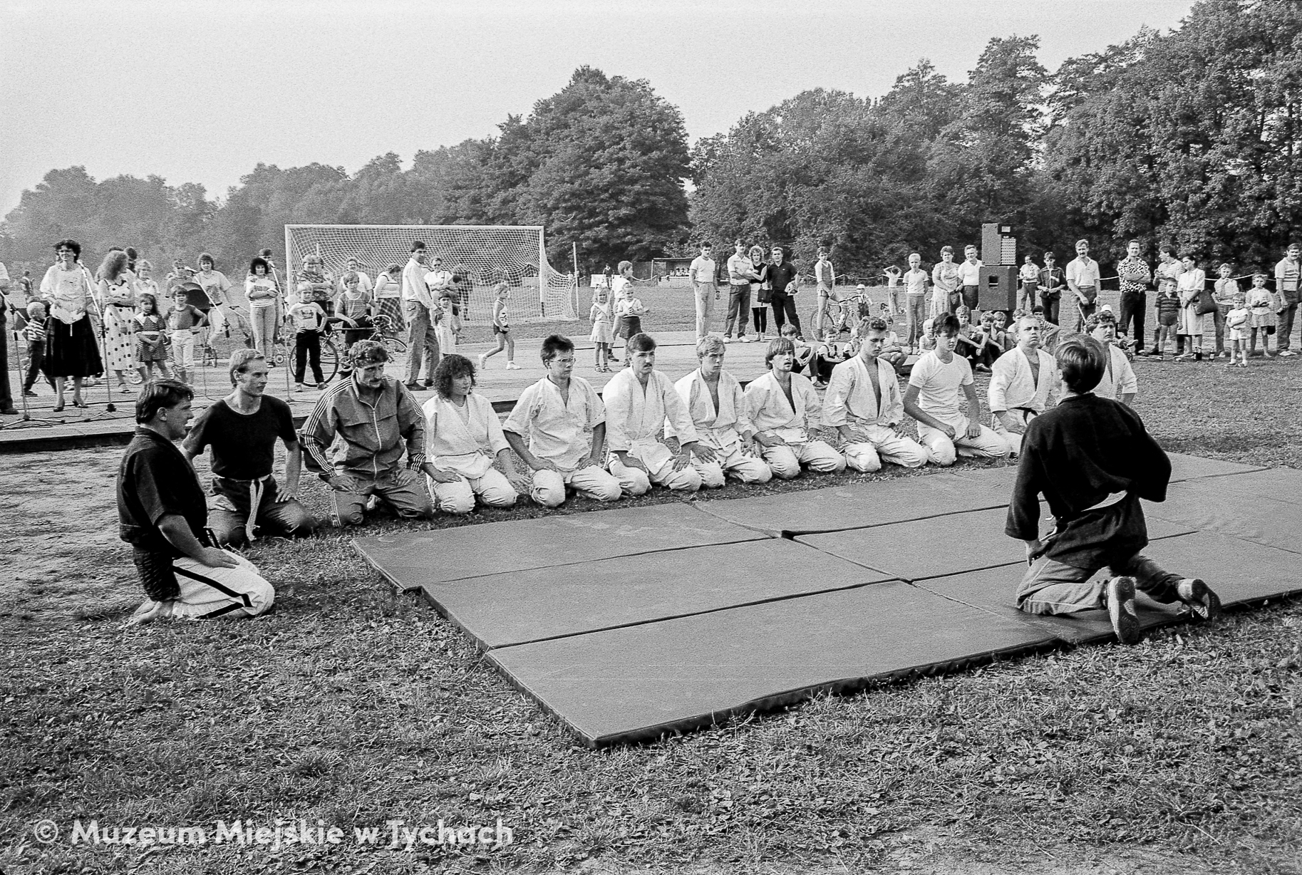 A sports and recreation festival held by the Solidarity movement at the sports ground in today's Władysława Andersa Street. Competitors from the self-defense division of the TKKF "Maluch" sports club about to stage an Asian martial arts demonstration.