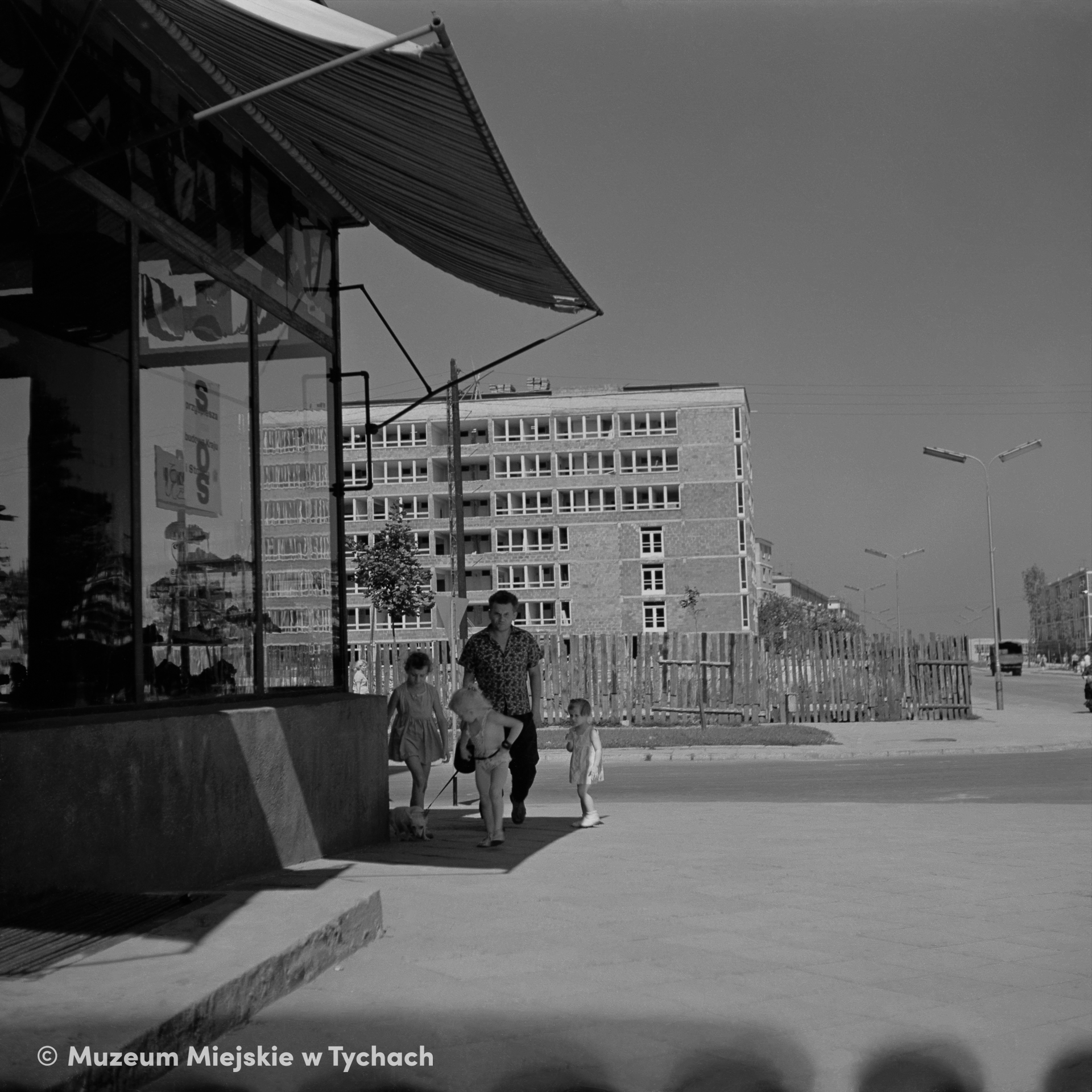 A man with three children turns from Cyganerii Street into Feliksa Dzierżyńskiego Street (now gen. Stefana Grota Roweckiego Street). Behind the fence in the background, the construction of the Miastoprojekt Nowe Tychy's office building (now the Inland Revenue Office) is underway.