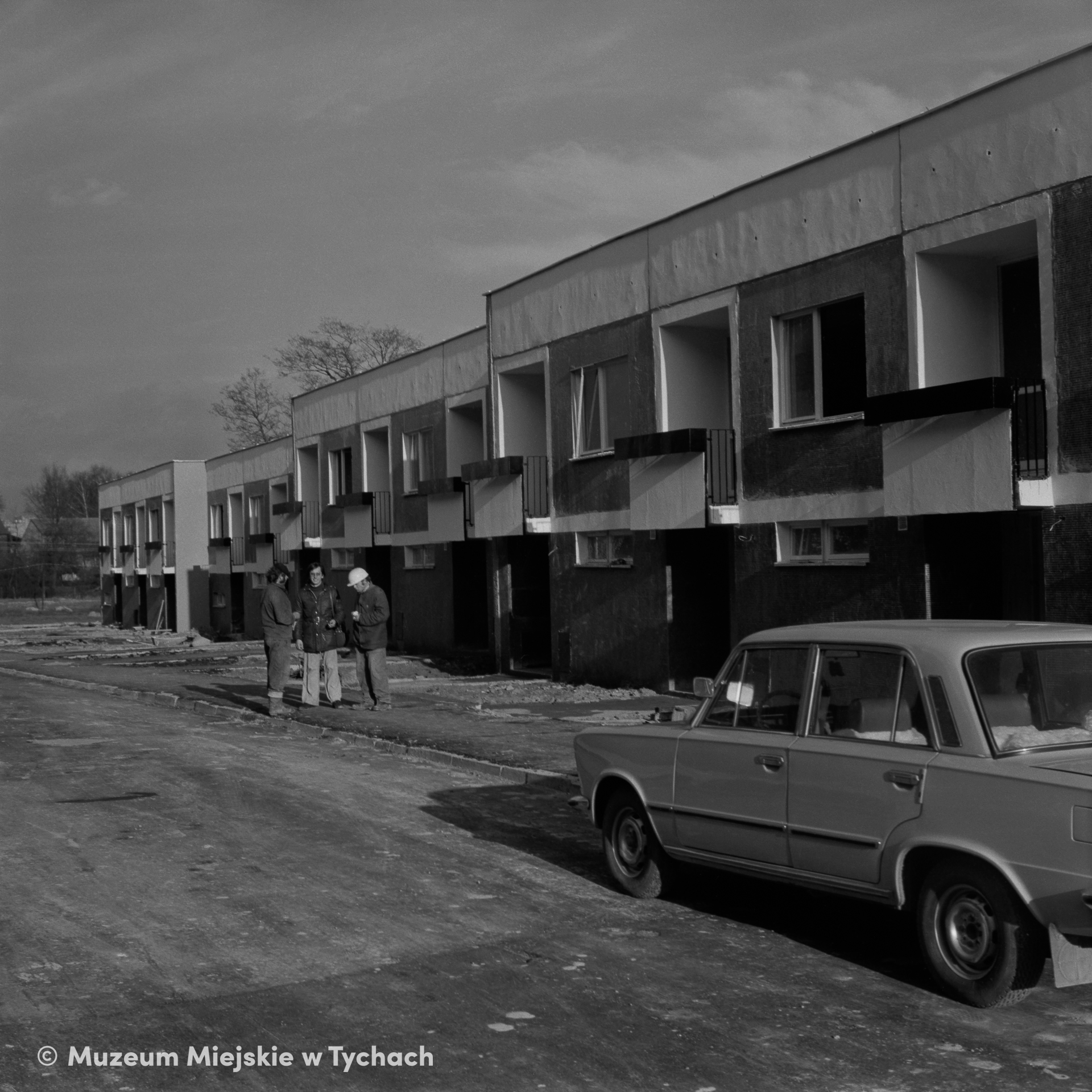 Three men (probably building contractors) stand on the pavement in front of Housing Estate O's terraced houses in Stefana Jaracza Street.