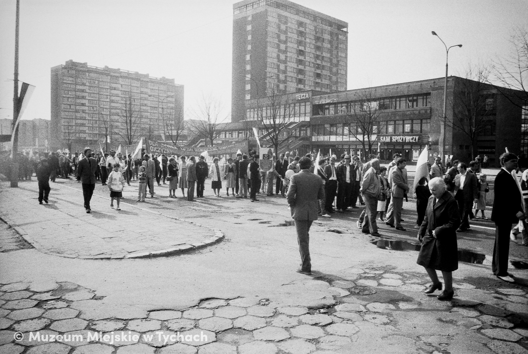 Participants of a Labour Day parade walk along Rewolucji Październikowej Avenue (Paprocańska Street until 1968, now Niepodległości Avenue) past the Cooperative Culture Centre 'Tęcza' with a self-service grocery shop and the Salamandra footwear shop on the ground floor. Shown in the background are Housing Estate D and G's blocks.