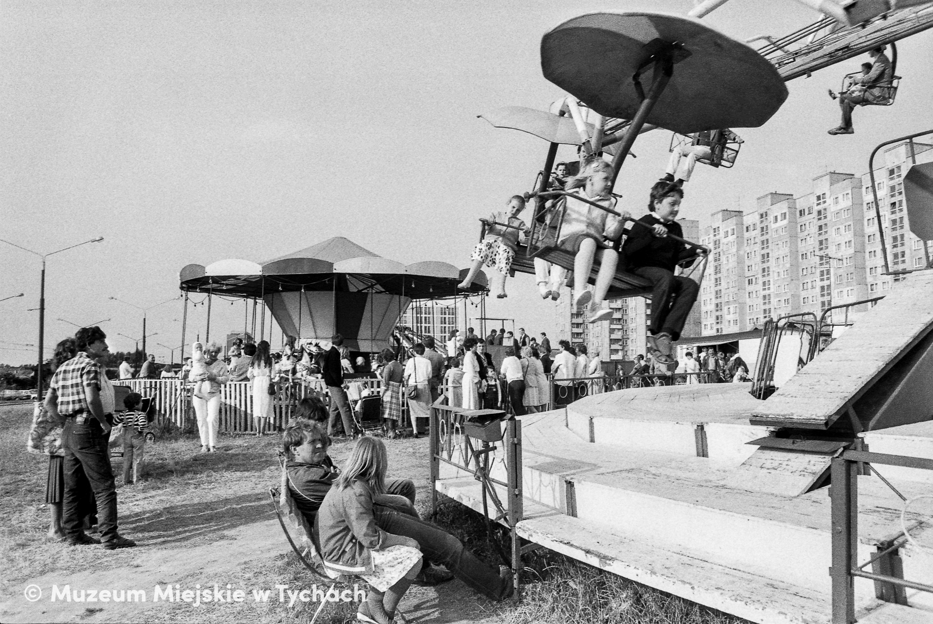 A funfair organised within Housing Estate N, near Aleksandra Zawadzkiego (now Romana Dmowskiego) and Zofii Nałkowskiej Streets. Children with guardians ride on merry-go-rounds. The background includes the Tychy Hotel and residential blocks.