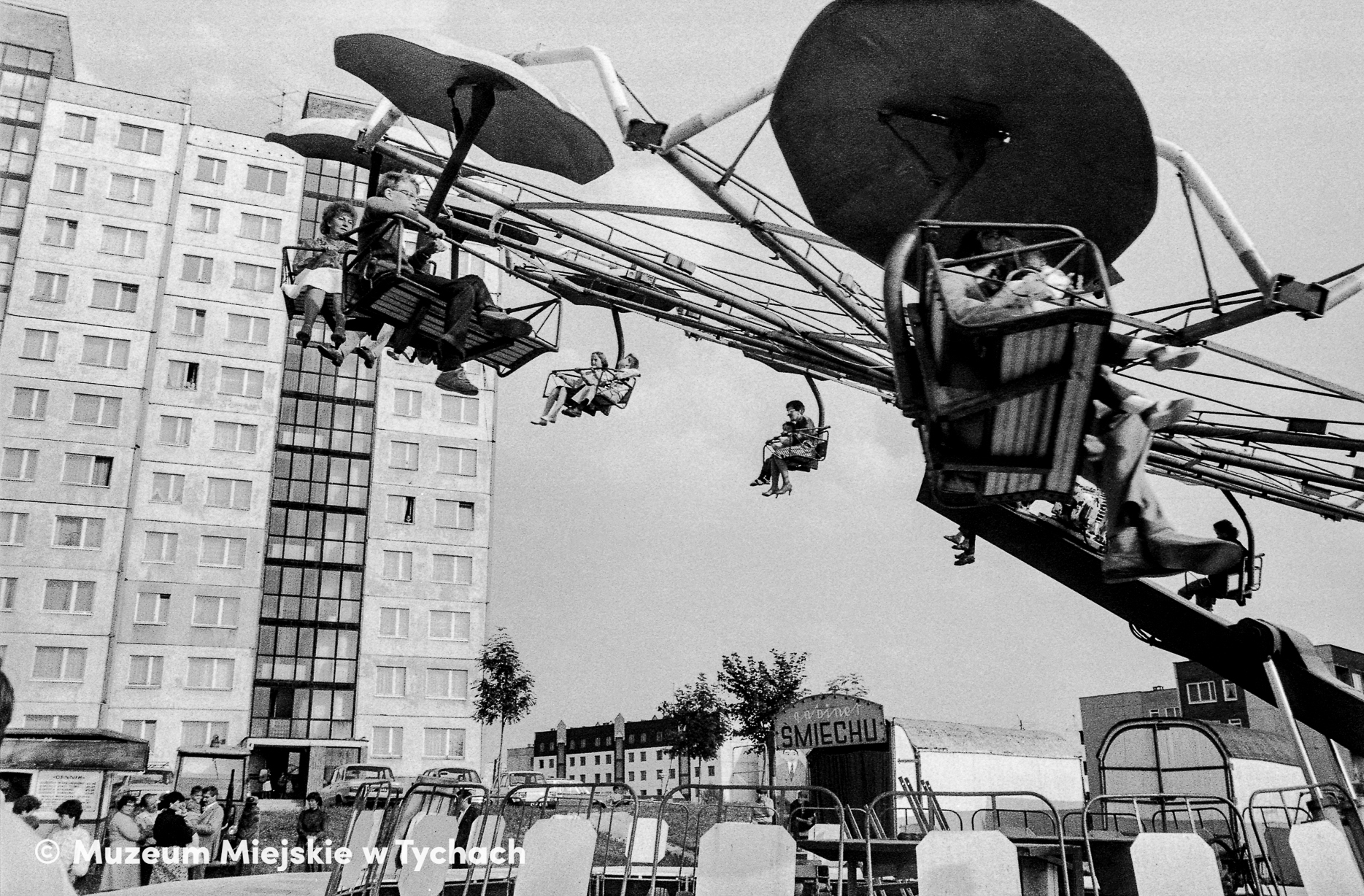 A funfair staged within Housing Estate N, near Aleksandra Zawadzkiego (now Romana Dmowskiego) and Zofii Nałkowskiej Streets. An empty merry-go-round ready to take riders. The caravan in the background houses a laughter room