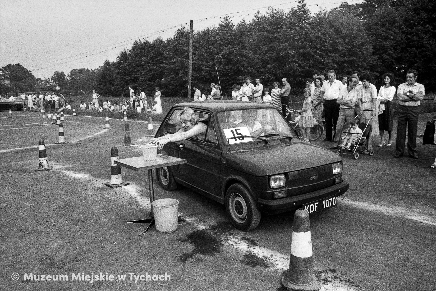 The GINKANA competition, held for FSM employees to celebrate reaching the production target of 2,000,000 Polish Fiat 126p cars. The racing skills competition continues, as the car driver and passenger negotiate an obstacle. The photo was taken on the premises of the today's car park in Nad Jeziorem Street.