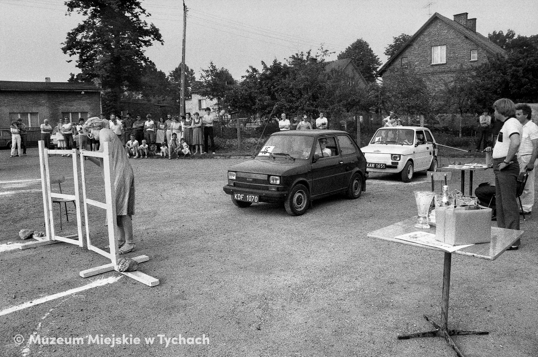 The GINKANA competition, held for FSM employees to celebrate reaching the production target of 2,000,000 Polish Fiat 126p cars. The racing skills competition continues, as two cars prepare to go on an obstacle course, witnessed by curious spectators. The photo was taken on the premises of the current parking lot at Nad Jeziorem Street. Residential properties in the background.