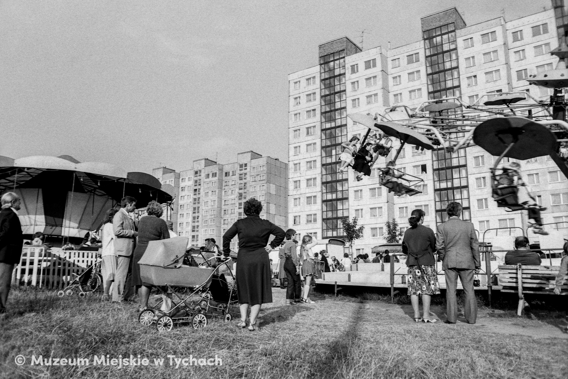 A funfair staged within Housing Estate N, near Aleksandra Zawadzkiego (now Romana Dmowskiego) and Zofii Nałkowskiej Streets. Children with guardians ride on a merry-go-round. Residential blocks in the background.