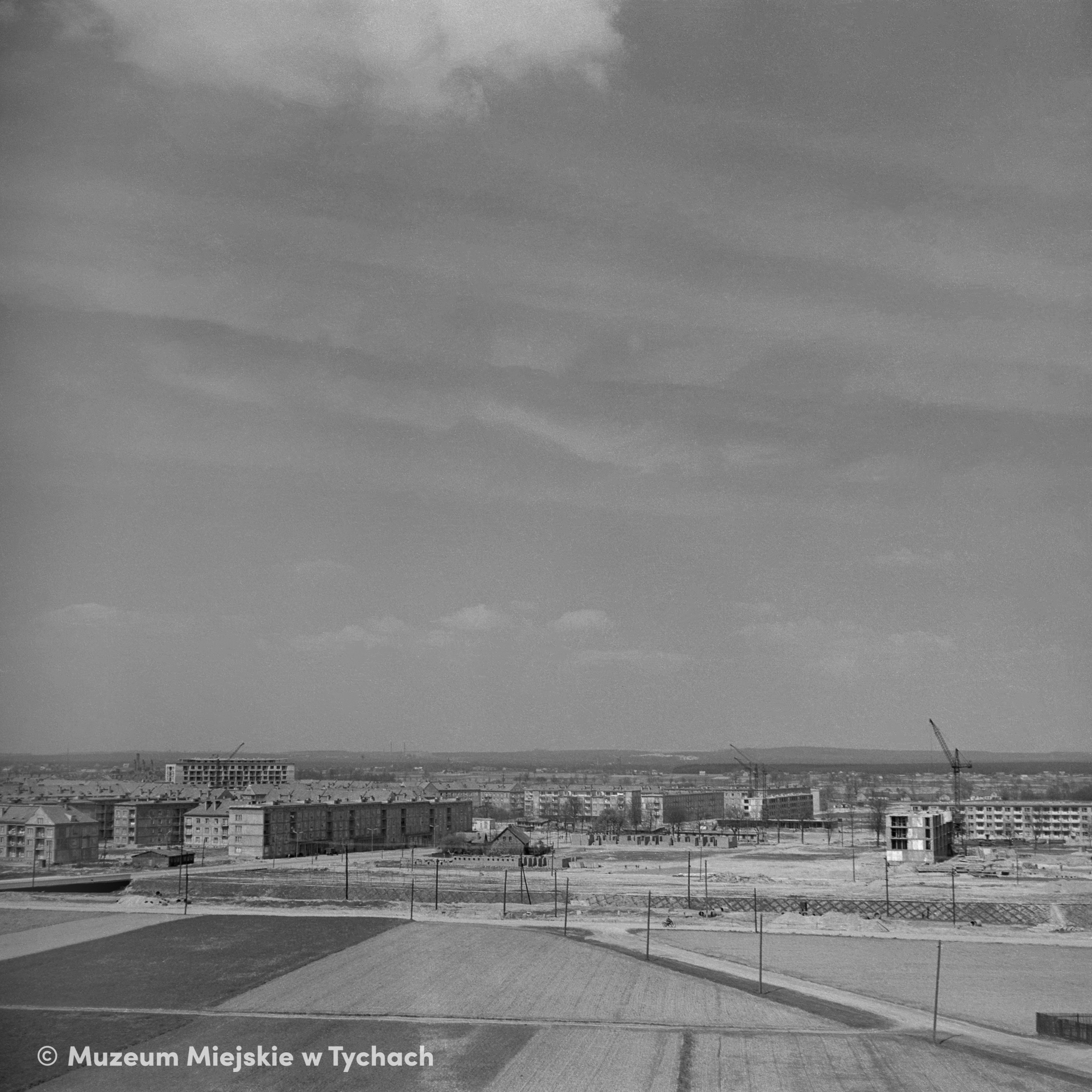 Widok z lotu ptaka na osiedla C (od lewej), E i D. Widoczny na zdjęciu po lewej most nad wykopem kolejowym to fragment przyszłej ulicy Feliksa Dzierżyńskiego (obecnie gen. Stefana Grota Roweckiego).