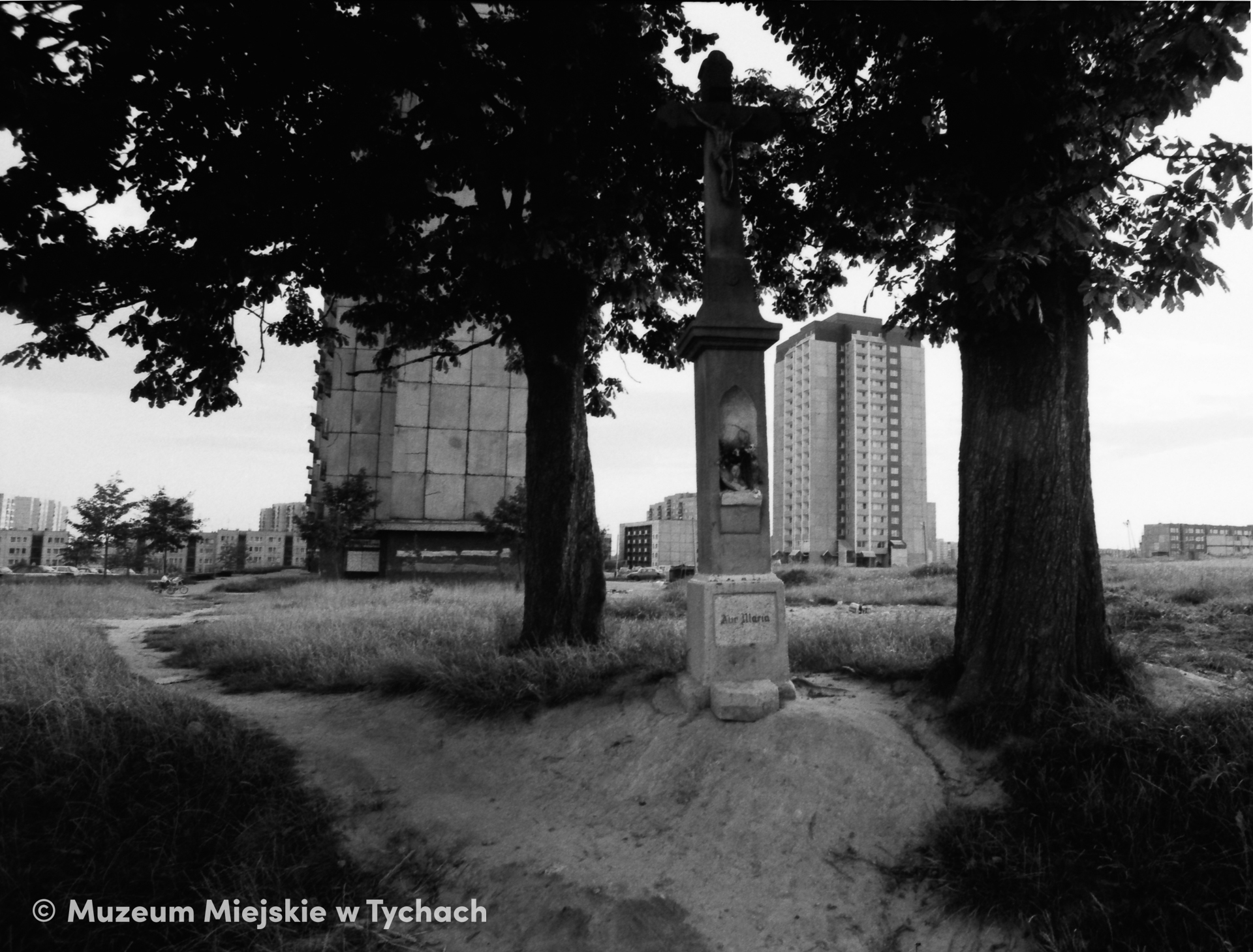 Kamienny krzyż z 1815 roku usytuowany przy drodze do Paprocan przed pierwszymi domami wsi. W głębi widok na budynki mieszkalne na osiedlu O.