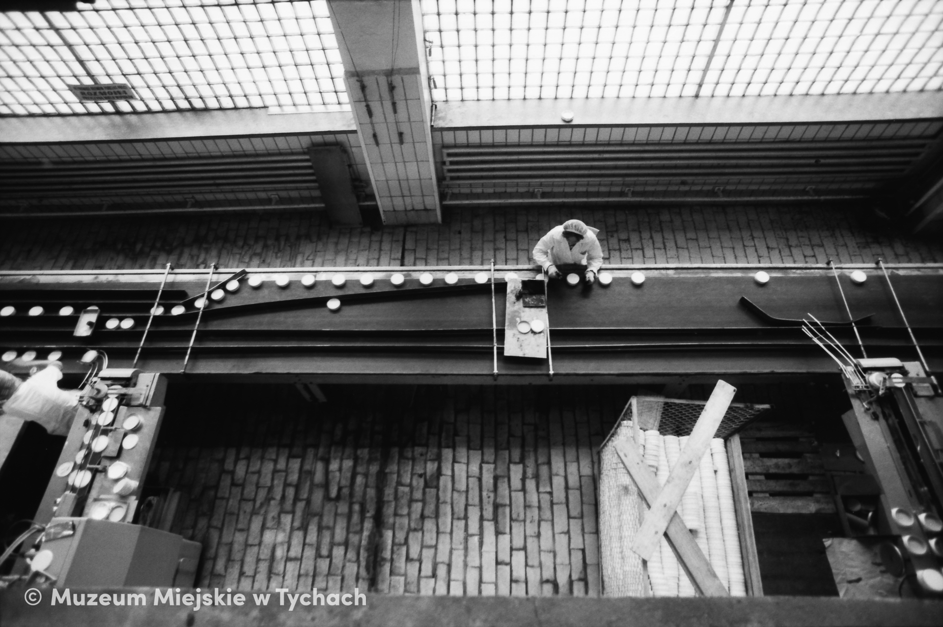 Pracownica przy taśmie produkcyjnej w Wytwórni Serów Topionych „SERTOP”. Widok z góry.