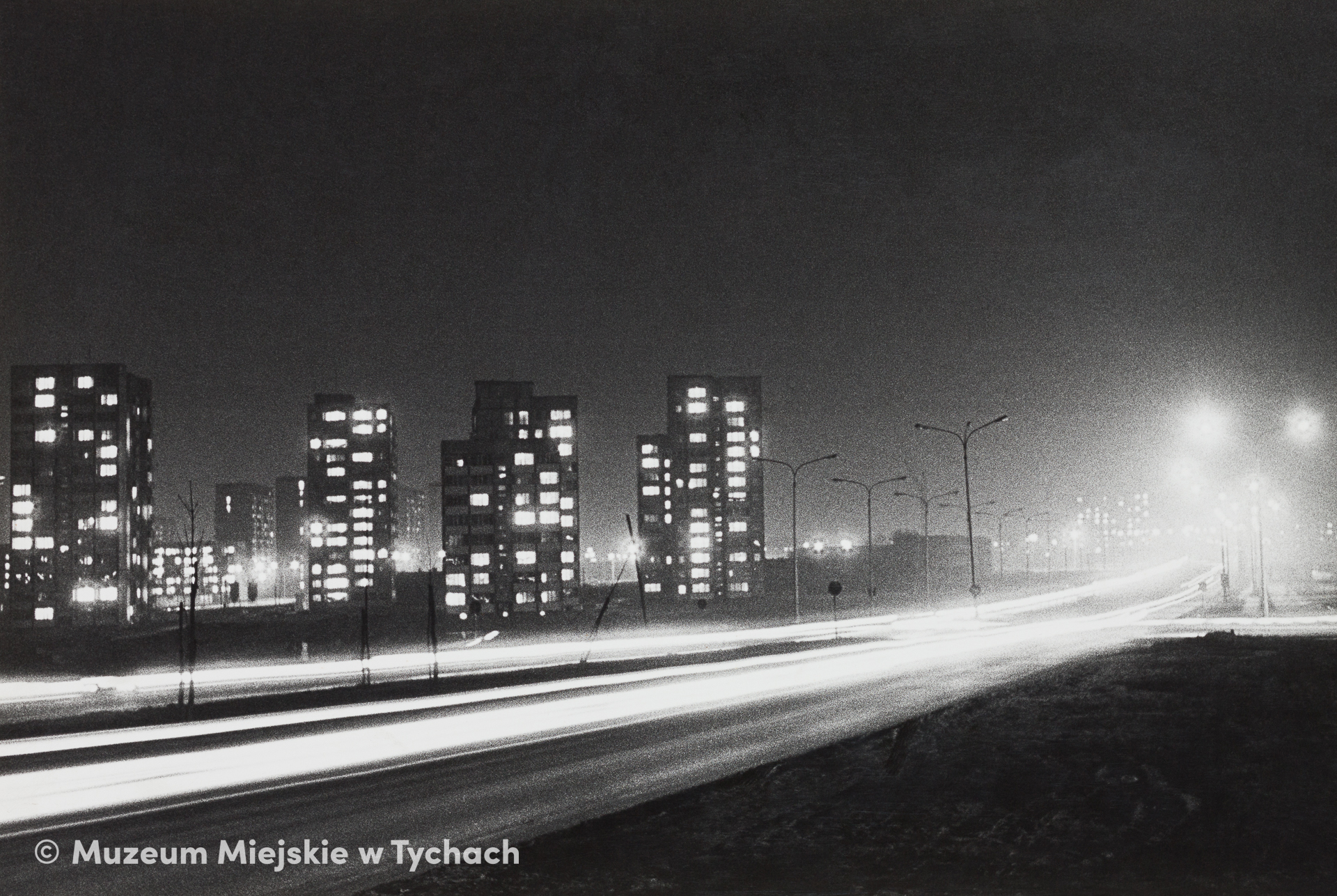 Widok nocą na aleję Bielską i fragment osiedla H4. Całościowy projekt osiedla H przygotował Janusz Włodarczyk we współpracy z Hanną Adamczewską-Wejchert i Kazimierzem Wejchertem. Tytuł odautorski „Tychy nocą II”.
