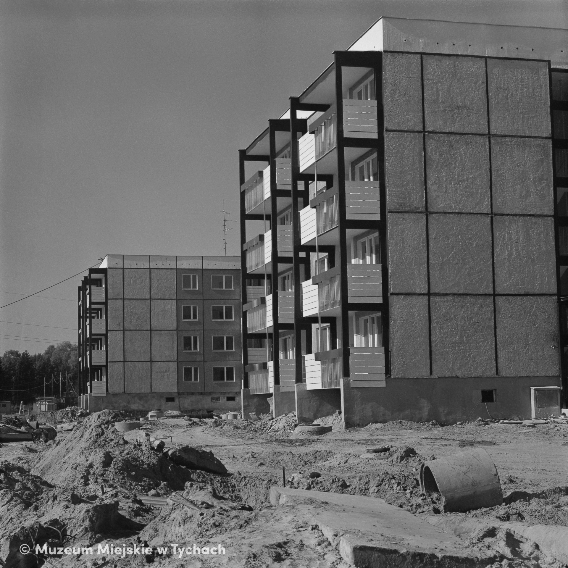 Widok od wschodu na trzypiętrowe budynki mieszkalne na osiedlu W między ulicami Hutniczą i Henryka Wieniawskiego. Domy usytuowano na granicy dawnej wsi Paprocany w niewielkiej odległości od terenów leśnych. Wokół budynków teren nieuporządkowany z pozostałościami po budowie.