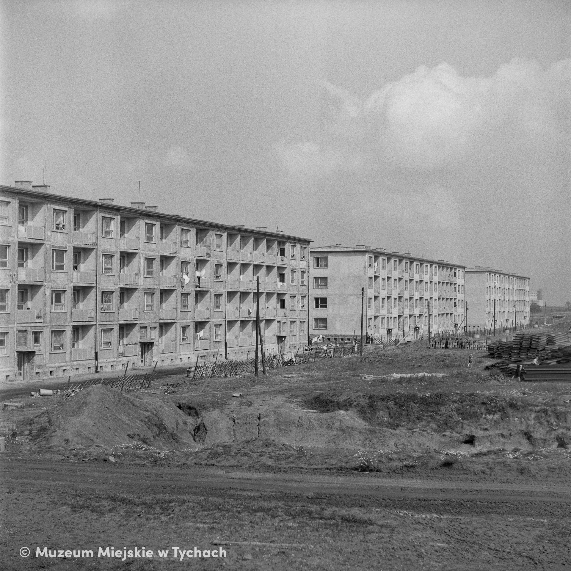 Widok od podwórza na trzyopiętrowe budynki mieszkalne przy projektowanej ulicy Paprocańskiej (od 1968 roku alei Rewolucji Październikowej, obecnie alei Niepodległości) na osiedlu D. Nieuporządkowany teren z fragmentem placu budowy.