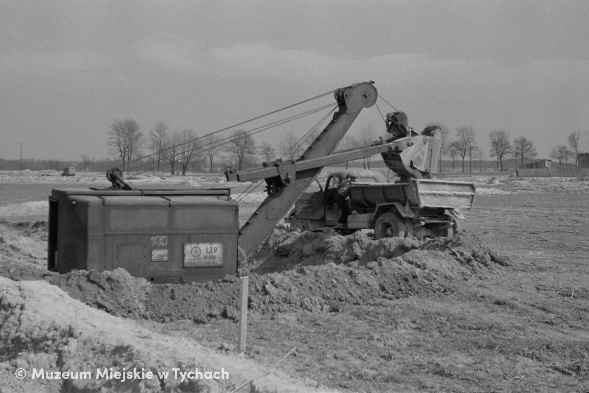 Roboty ziemne na starotyskich polach przewidzianych pod budowę osiedla C. Koparka ładuje na samochód ciężarowy Ził 150 grunt wybrany z wykopu pod przyszłe fundamenty. W głębi droga do Paprocan.