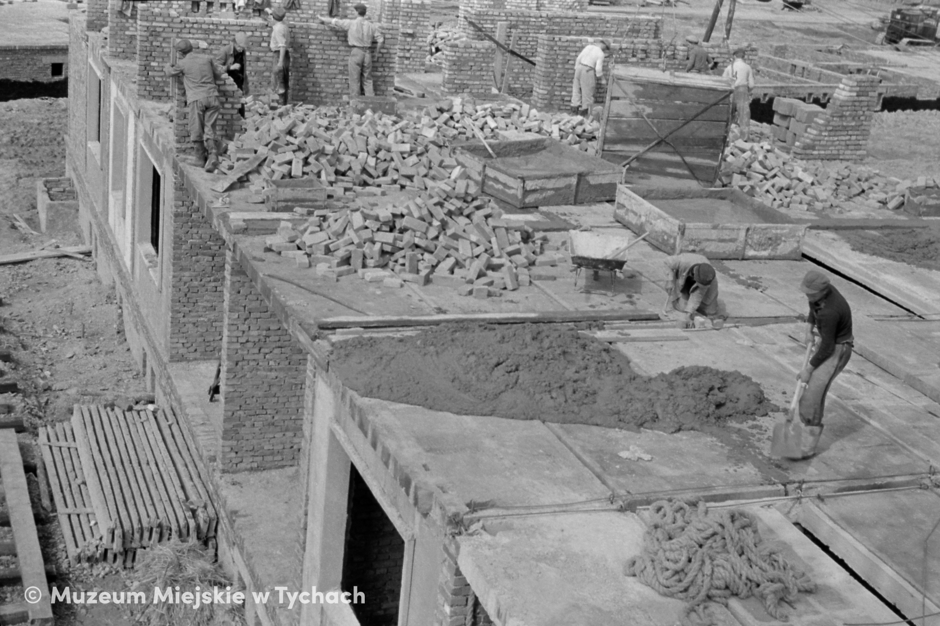 Roboty murarskie na drugiej kondygnacji budynku mieszkalnego zlokalizowanego przy projektowanej ulicy Cyganerii, w pobliżu kotłowni osiedlowej. Widok od południowego wschodu.