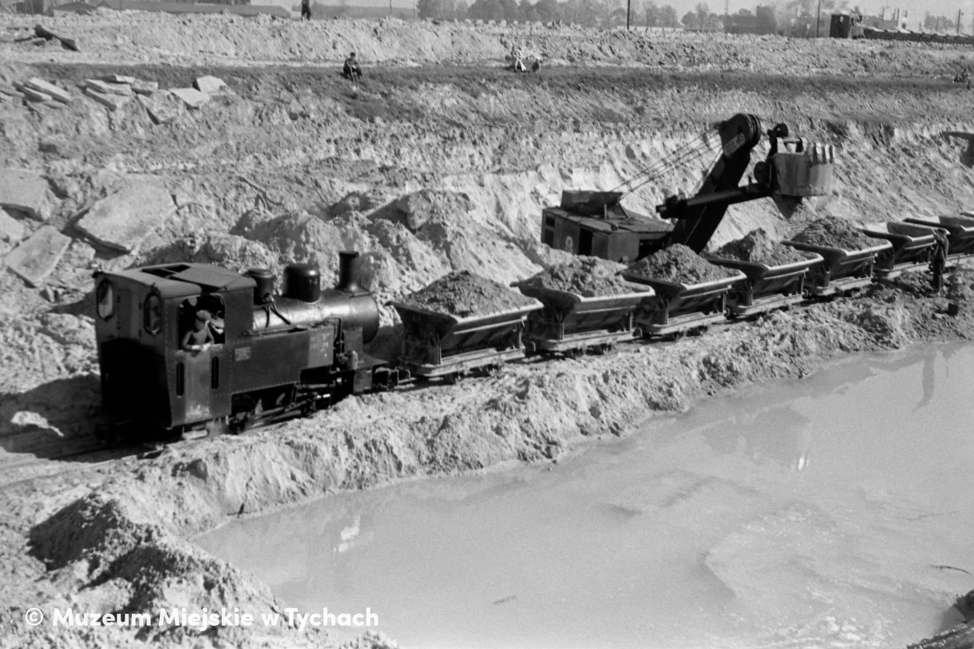 Widok od północnego zachodu na budowę wykopu kolejowego. Koparka ładuje grunt wybierany z wytyczonego wzdłuż osiedla C wykopu na wagony kolejki wąskotorowej. W głębi początek budowy wschodniej części osiedla C.