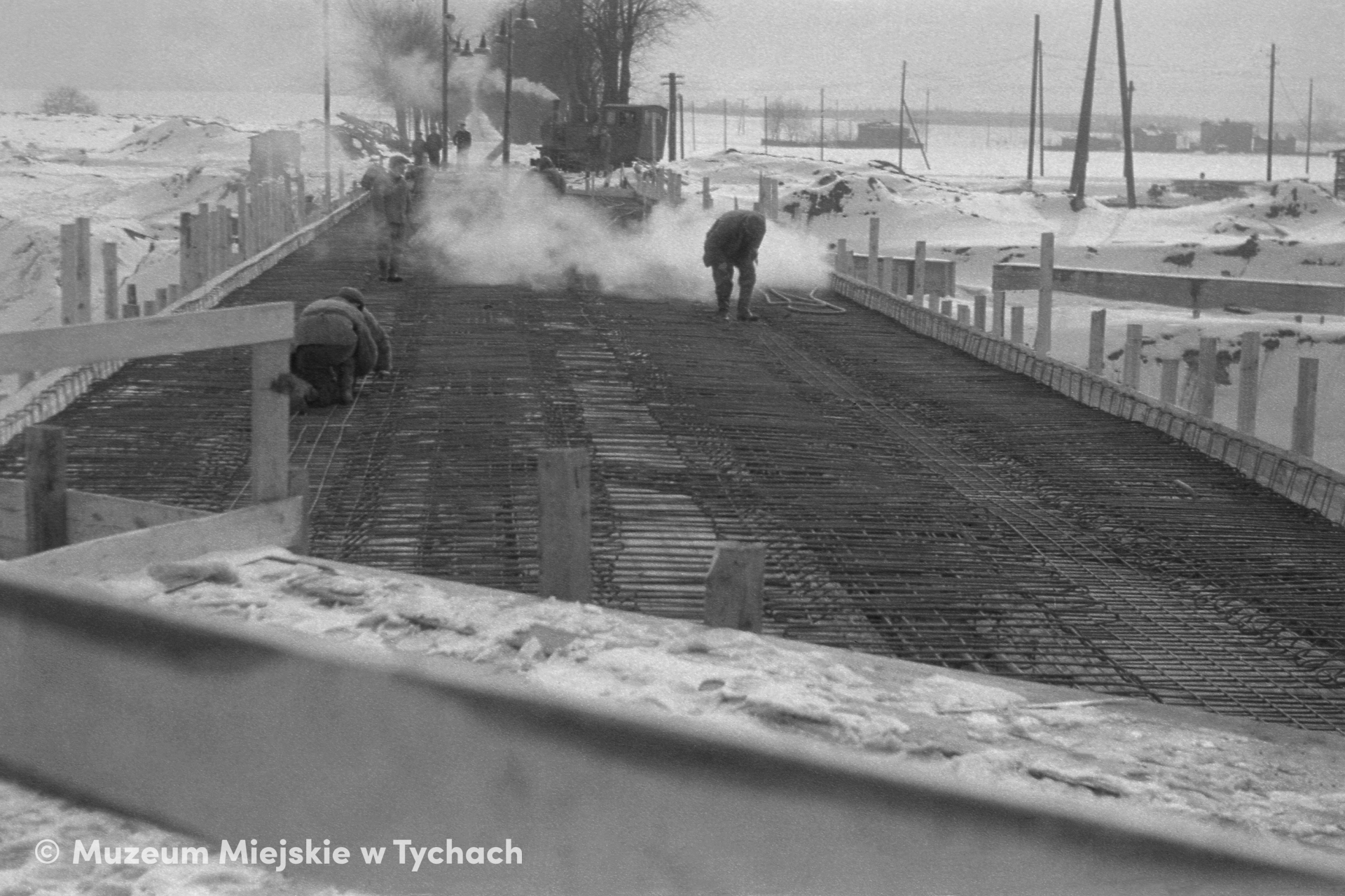 Budowa mostu nad wykopem kolejowym na wysokości alei Bielskiej. Widok od północy.