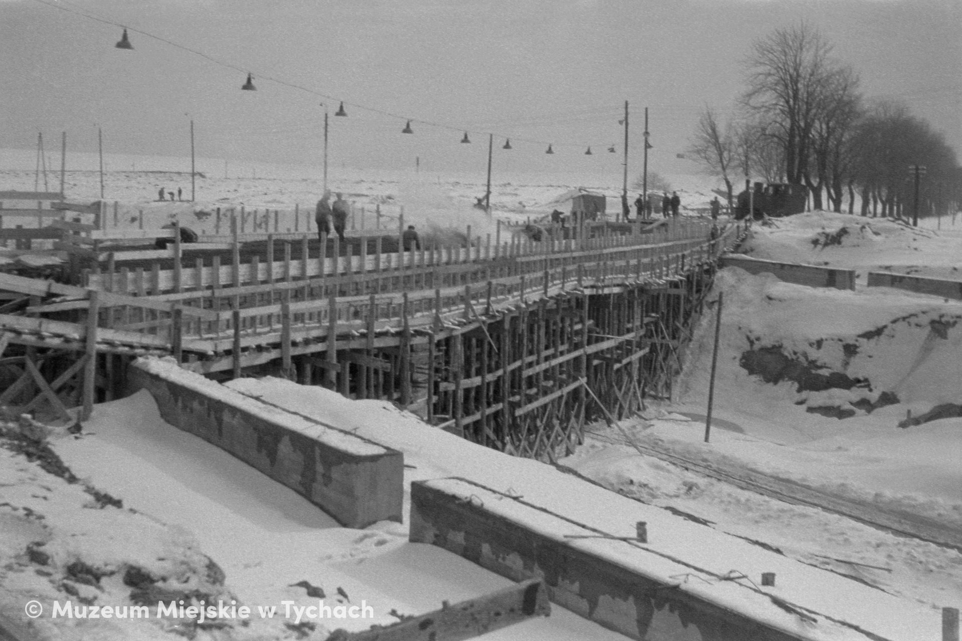 Budowa mostu nad wykopem kolejowym na wysokości alei Bielskiej. Widok od północy.