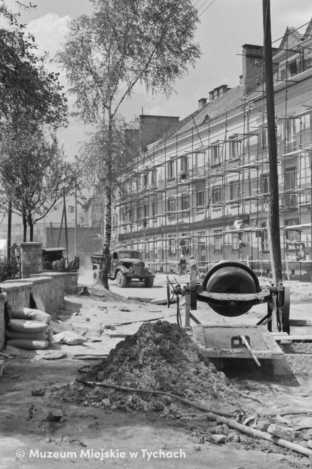 Widok od południowego wschodu na ścianę budynku mieszkalnego z rusztowaniem, na którym pracują tynkarze. Na poboczu ulicy przenośna betoniarka przygotowuje zaprawę tynkarską. W głębi samochód ciężarowy Ził 150.
