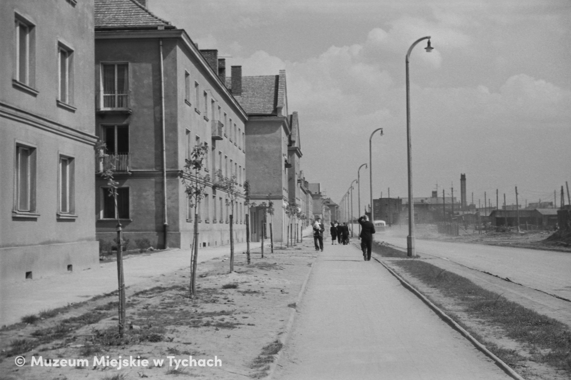 Widok od północnego zachodu na budynki mieszkalne oraz ciągi pieszy i rowerowy wzdłuż ulicy Budowlanych. Po drugiej stronie ulicy teren zakładu prefabrykacji.