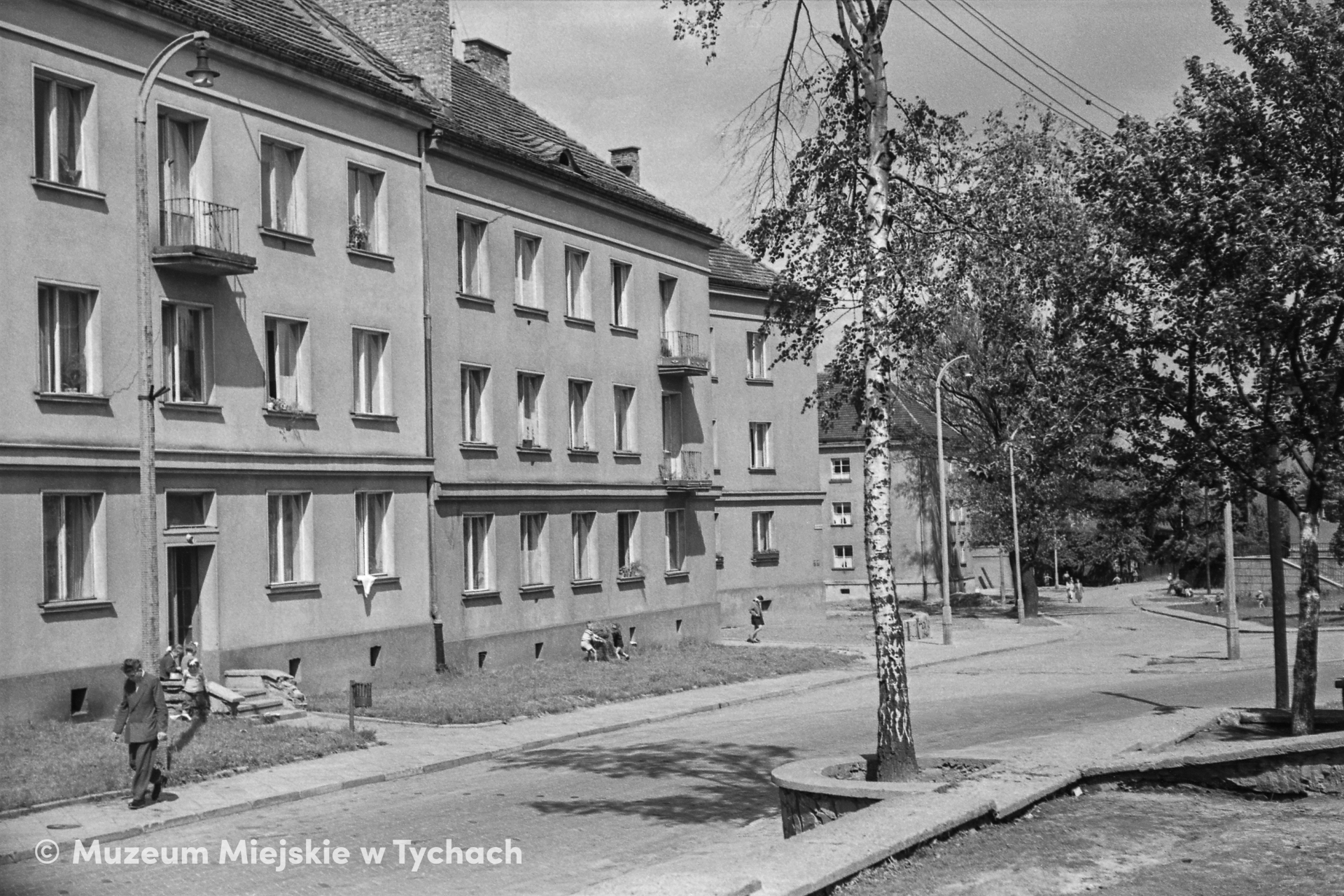 Widok od zachodu na budynki mieszkalne usytuowane wzdłuż ulic Bolesława Bieruta (obecnie Stefana Batorego) i Bohaterów Warszawy. Obie ulice łączą się ze sobą w pobliżu budynku mieszkalnego z restauracją Tyską na parterze.
