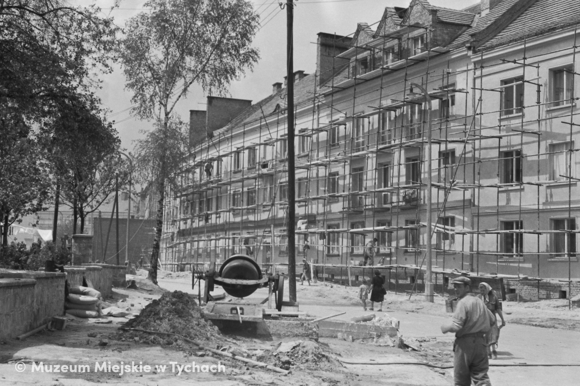 Widok od południowego wschodu na ścianę budynku mieszkalnego z rusztowaniem, na którym pracują tynkarze. Na poboczu ulicy przenośna betoniarka przygotowuje zaprawę tynkarską.