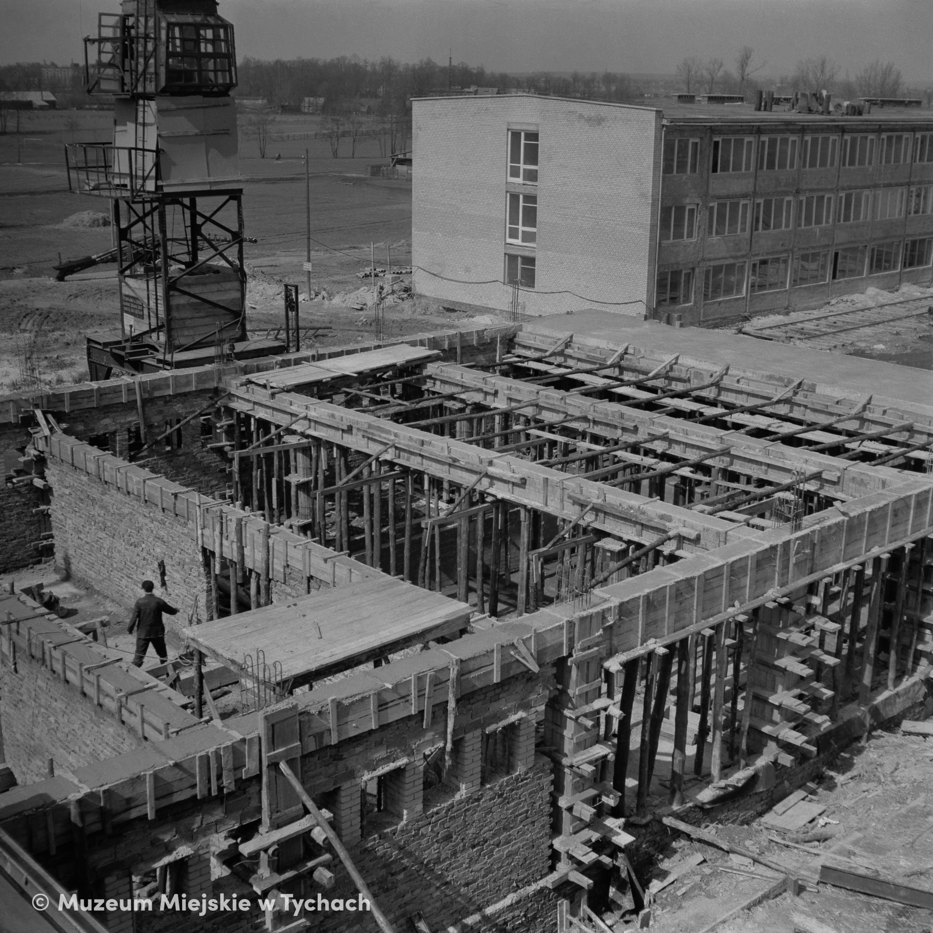 Budowa obiektu sportowego przy Technikum Budowlanym i Szkole Rzemiosł Budowlanych (obecnie Zespół Szkół nr 5). Po prawej stronie fragment budynku internatu szkoły.