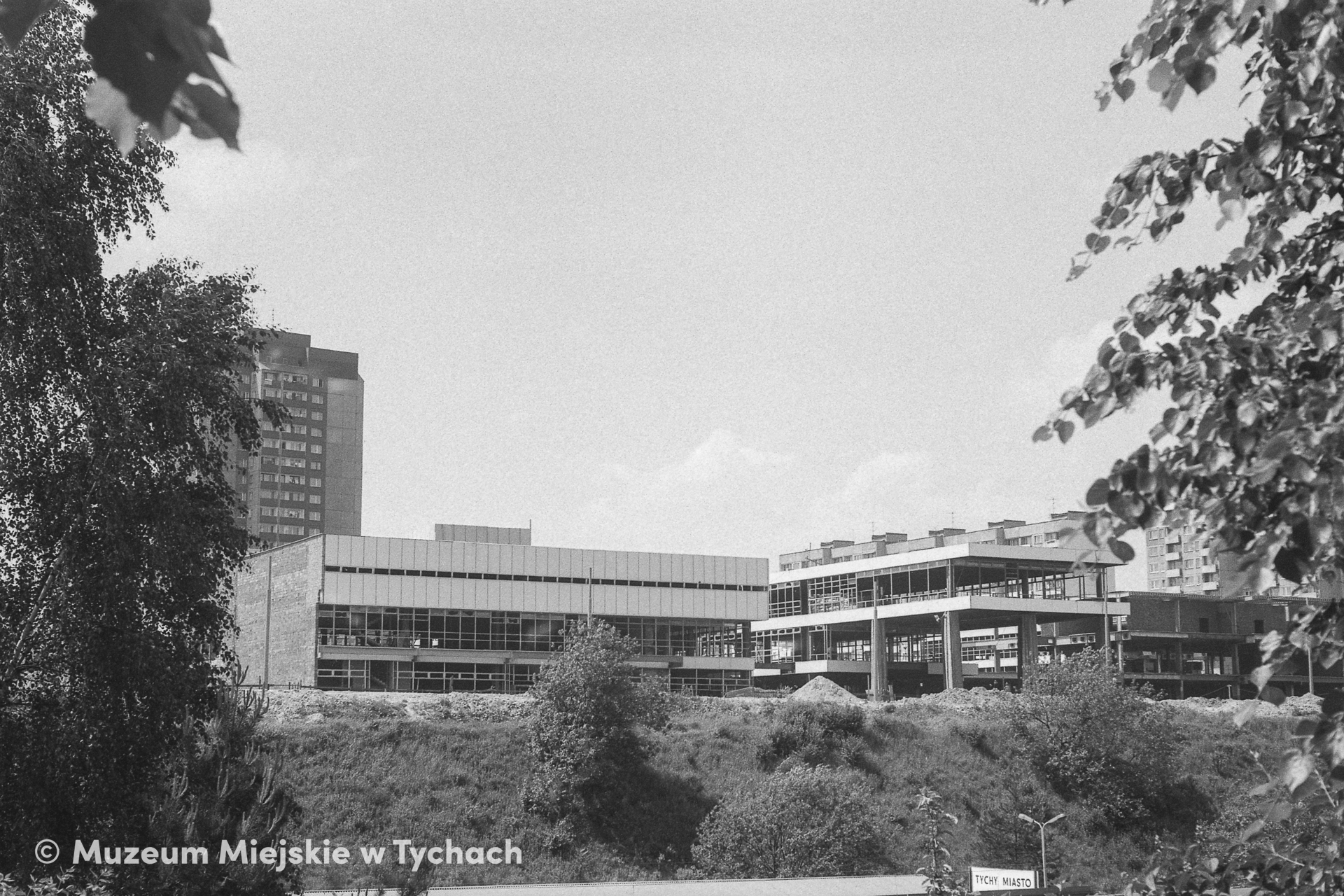 Widok na pawilony handlowe – fragment niedokończonego centrum usługowo-handlowego w Tychach. Przed nimi skarpa wykopu kolejowego, przebiegającego przez środek miasta, i tablica z nazwą stacji Tychy Miasto.