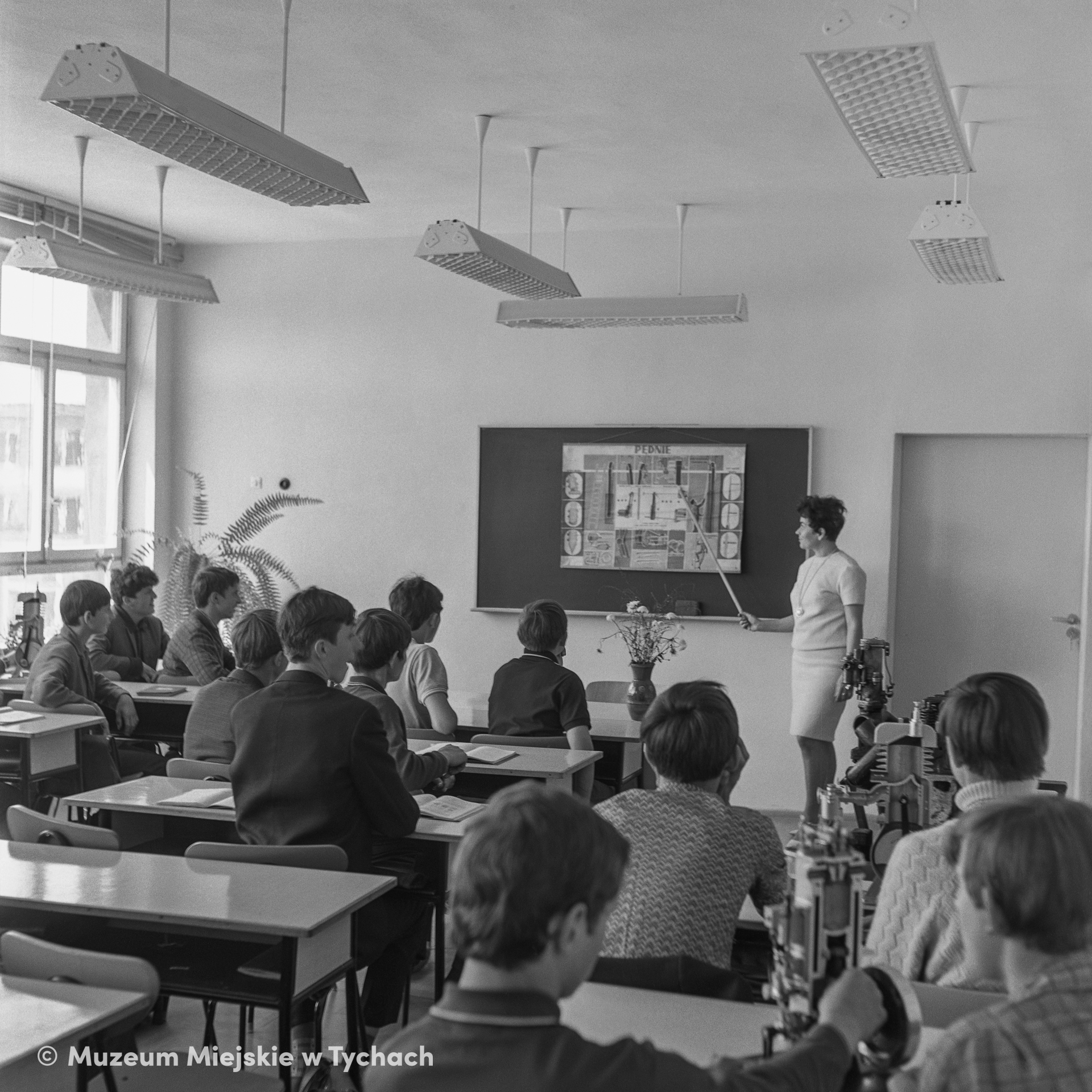 Nauczycielka z młodzieżą podczas lekcji maszynoznawstwa w budynku Zasadniczej Szkoły Budowlanej.